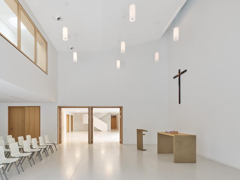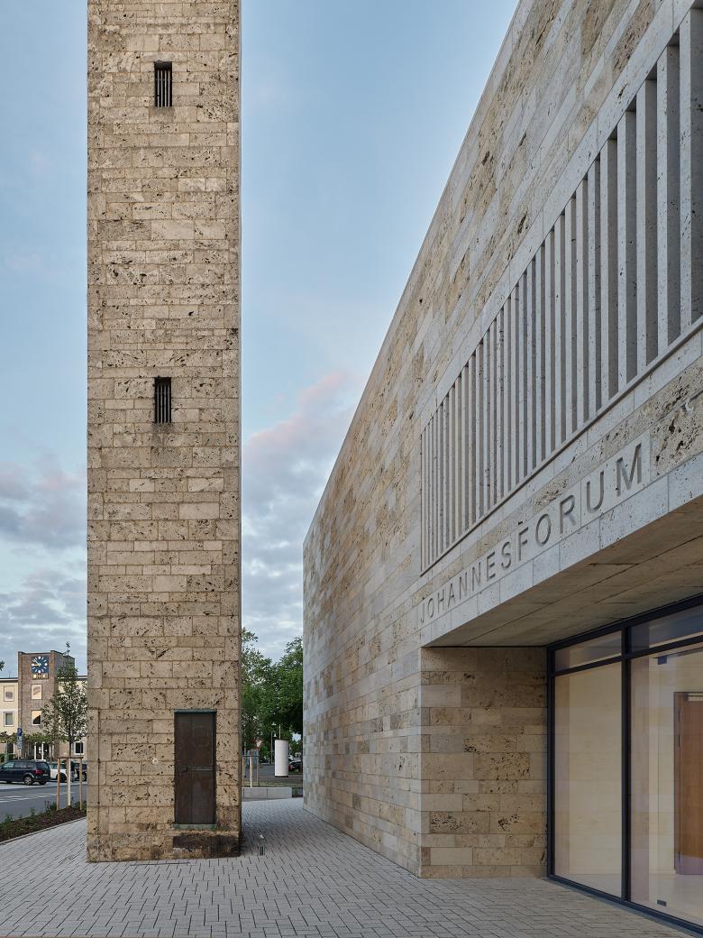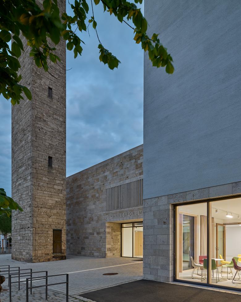 Die beiden leicht zueinander versetzten Baukörper spannen den gemeinsamen Vorplatz auf und definieren den Eingangsbereich des neuen Quartierszentrums. Die beiden Nutzungsbereiche sind Außen wie Innen klar ablesbar. Die gemeinschaftlich genutzten Flächen am Foyer stärken den inklusiven Gedanken des Projektes. Der zweigeschossige, multifunktional nutzbarer Saal im Erdgeschoss bildet das Herzstück des neuen Johannesforums und ermöglicht vielfältige Begegnungen. Ein großzügig gerahmtes „Schaufenster“ ermöglicht die Verbindung zwischen Innen- und Außenraum. Durch den Erhalt des freistehenden Kirchturmes, die Weiterverwendung des eingelagerten Natursteines und den Einbau alter Kirchenfenster konnte die Identität des Ortes beibehalten werden.