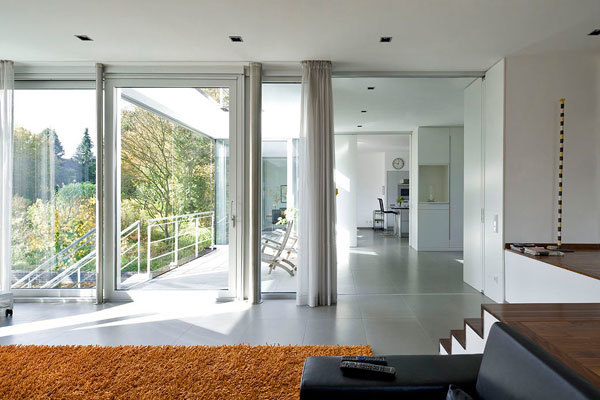 Das Wohnhaus liegt in einem gewachsenen Wohngebiet von Duisburg - Rumeln. Die Umgebung prägt eine Bungalowbebauung der 70er Jahre. Aus der Höhendifferenz des Eingangs und Gartenniveaus entstand der Gedanke eines höhenversetzten gegliederten Gebäudes. Eine offene Raumfolge vom Wohn- und Essbereich mit Küche schafft fließende Räume und vielfältige Sichtbeziehungen. Durch großzügige Schiebetüren ist jedoch auch jederzeit eine gewollte Intimität möglich.