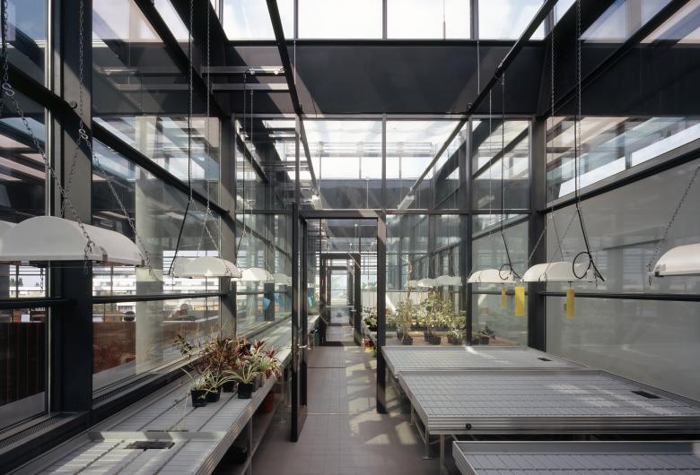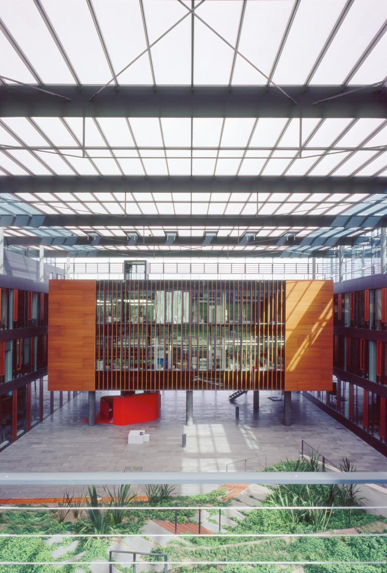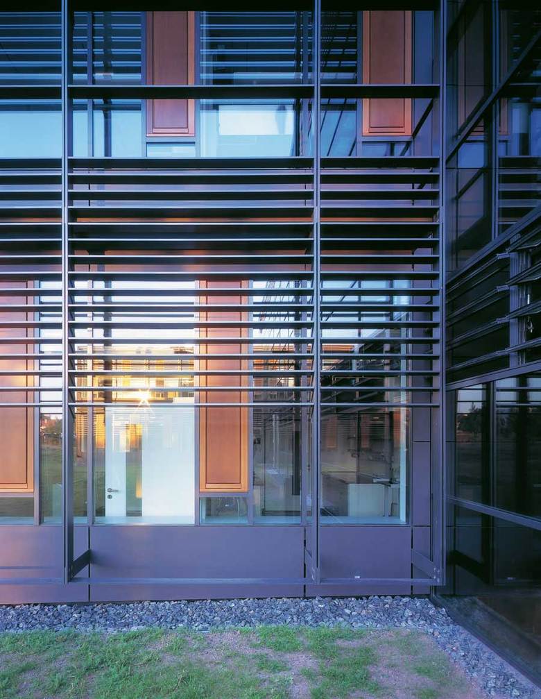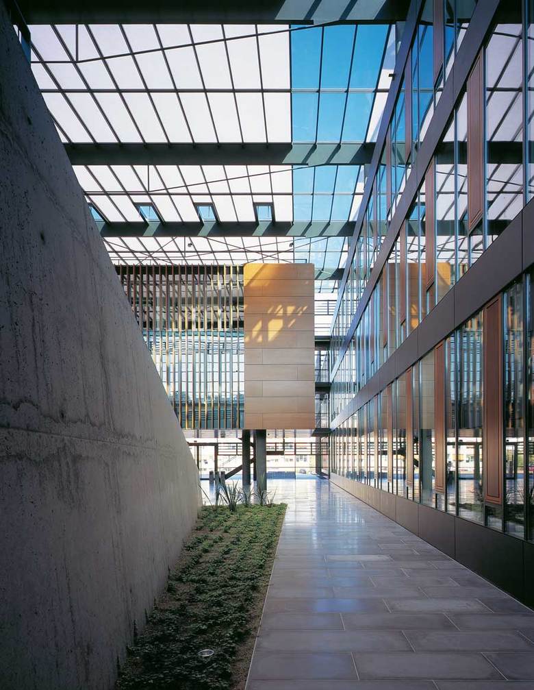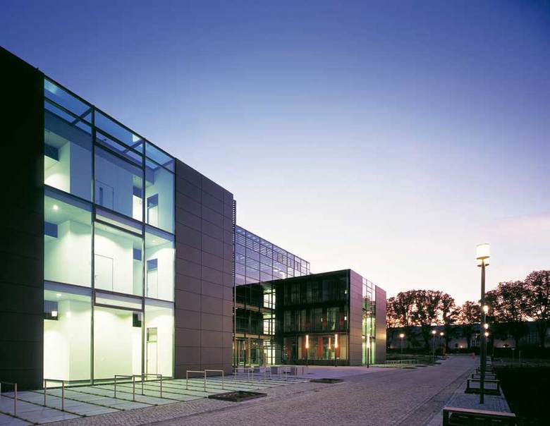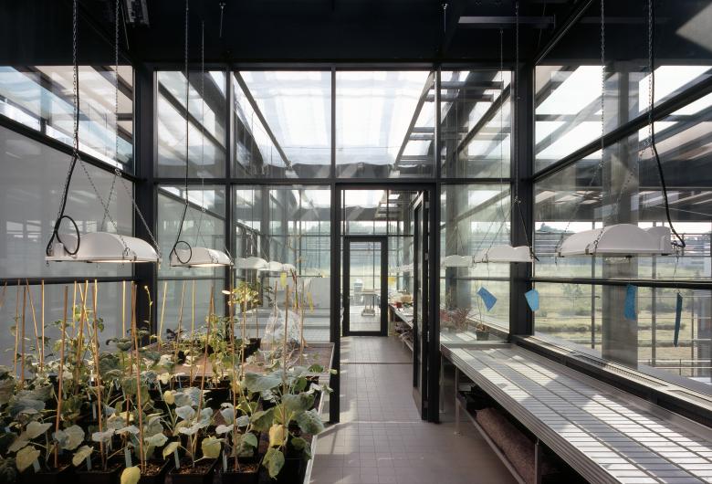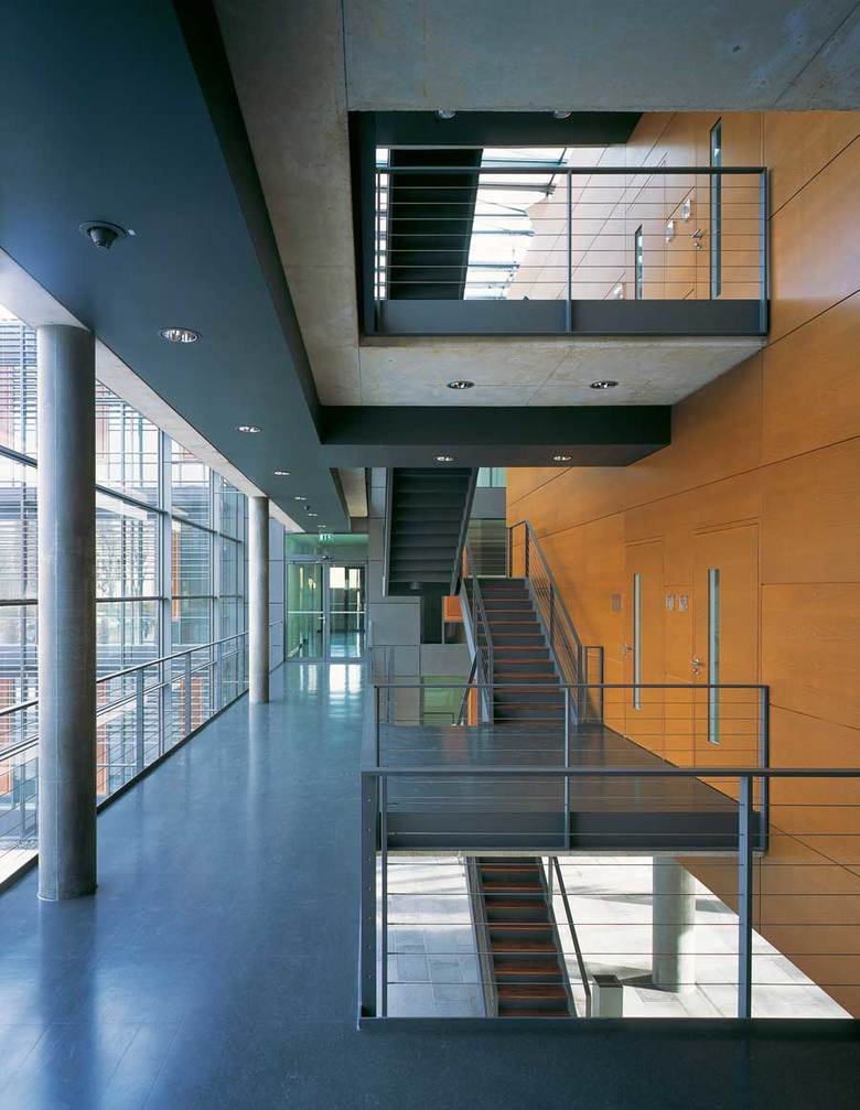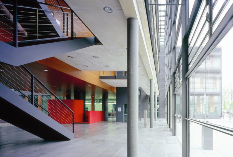 Eine verglaste Halle führt die umgebende Landschaft terrassenartig bis in das Gebäudeensemble hinein und verbindet als Kommunikationszentrum für Forschung und Lehre die beiden parallelen, mit anthrazitfarbenen Faserzementplatten verkleideten Gebäuderiegel der vier Institute. Die zentralen Praktikumsräume bilden in Form eines hölzernen Kubus einen solitären Baukörper innerhalb der Halle.