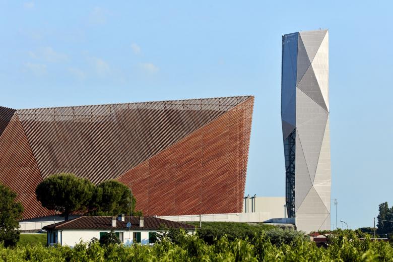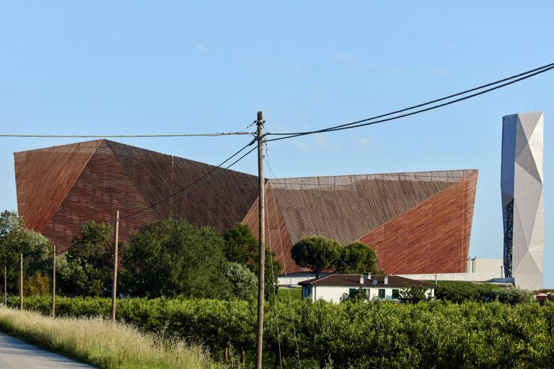 Il masterplan del Polo definisce un dispositivo ambientale a bassa tecnologia originato dal disegno di un terrapieno che funge da punto di interfaccia tra l’area rurale e quella industriale. “Tutto il progetto parte dal disegno del margine”, racconta Giovanni Vaccarini per spiegare come attraverso la presenza e il progetto naturalistico delle “dune”, tipiche del paesaggio adriatico e qui realizzate su tutto il confine dell’area, si sia proceduto a una generale opera di schermatura e mitigazione ambientale del polo. I bordi dell’area sono stati pensati come dei terrapieni dall’altezza variabile tra tre e dieci metri, sormontati da alberi e percorsi da piste ciclabili e pedonali, che definiscono il margine dell’intervento e l’interfaccia tra i due ambiti: quello agricolo e quello dedicato alla produzione energetica.