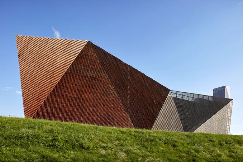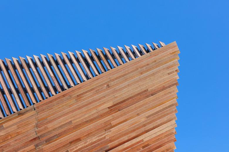 Le grandi superfici triangolari che coprono i volumi della caldaia e del camino sovvertendone le geometrie sono realizzate con strutture in acciaio sulle quali è posata una tessitura lignea a elementi paralleli. L’orditura delle scandole lignee segue però un pattern che cambia direzione a ogni faccia, offrendo così all’osservatore percezioni costantemente mutevoli in funzione del punto di osservazione, delle differenti ore del giorno o delle condizioni di luce. Il rivestimento in legno è anche un omaggio all’arte dell’intreccio e alle architetture nomadiche.
