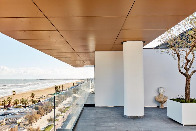 bands. The front band of the apartment, the one most open to the public domain, is thus opposite to the service band, which includes the vertical distribution, bathrooms, kitchens, laundries, and further back the more private quarters with bedrooms and studios. Following this logic, the building further develops its dialogue with the surrounding environment. The front of