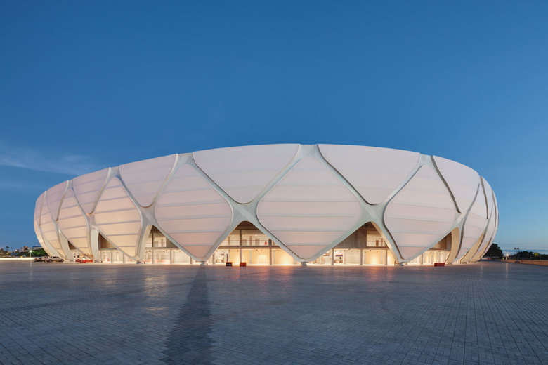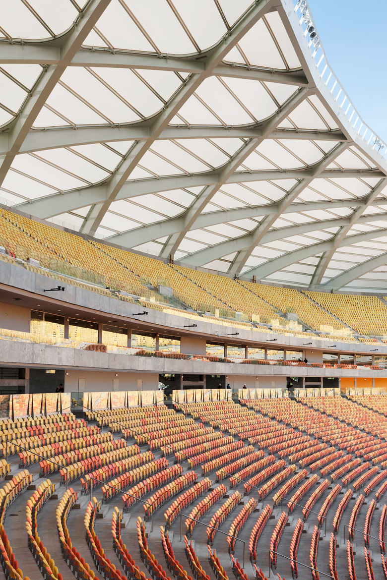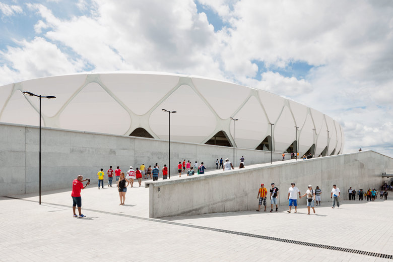Die Dachkonstruktion setzt sich aus sich gegenseitig aussteifenden Kragarmen zusammen, deren Stahlhohlkastenträger gleichzeitig als große Rinnen dienen, um die enormen Wassermassen der tropischen Niederschläge aufzunehmen. Angesichts des heißen und feuchten Klimas am Amazonas geht das Dach in eine Fassade über, die auch die Zuschauerumgänge und Vertikalerschließungen verschattet. Dach- und Fassadenfelder bestehen aus transluzentem Glasfasergewebe. Die im Zusammenspiel mit den Fassadenöffnungen entstehende natürliche Ventilation fördert ein angenehmes Mikroklima.