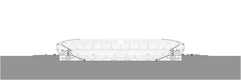 Die natürliche Topografie nutzend, befindet sich das Stadion auf einem in den leichten Hang gesetzten Sockel, in dem sich kommerzielle Nutzungen und Stellplätze befinden. Ein umlaufender Ring aus Logen, Büroflächen und Fanrestaurant trennt den Oberrang von dem in den Sockel eingelassenen Unterrang.