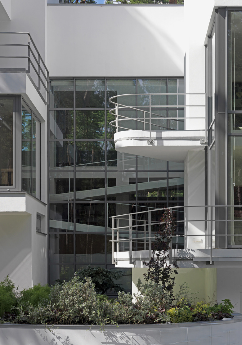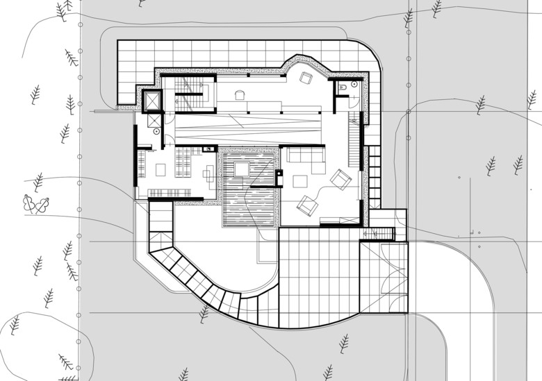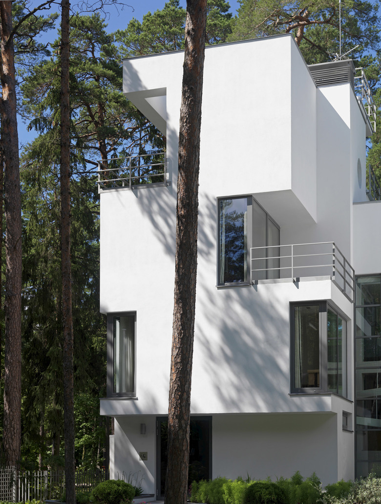 Bei dem Entwurf der Villa stand nicht die eigentliche Funktionalität im Vordergrund, sondern das räumliche Erlebnis, hervorgerufen durch den Dialog mit der umgebenden Natur und den Ausblick über die Bäume hinweg zur Ostsee. Formal in der Tradition der Moderne verankert, ist die gesamte Villa als Split-Level-Haus mit versetzten Ebenen organisiert, die über eine mehrläufige Rampe als zentrales Element miteinander verbunden sind.