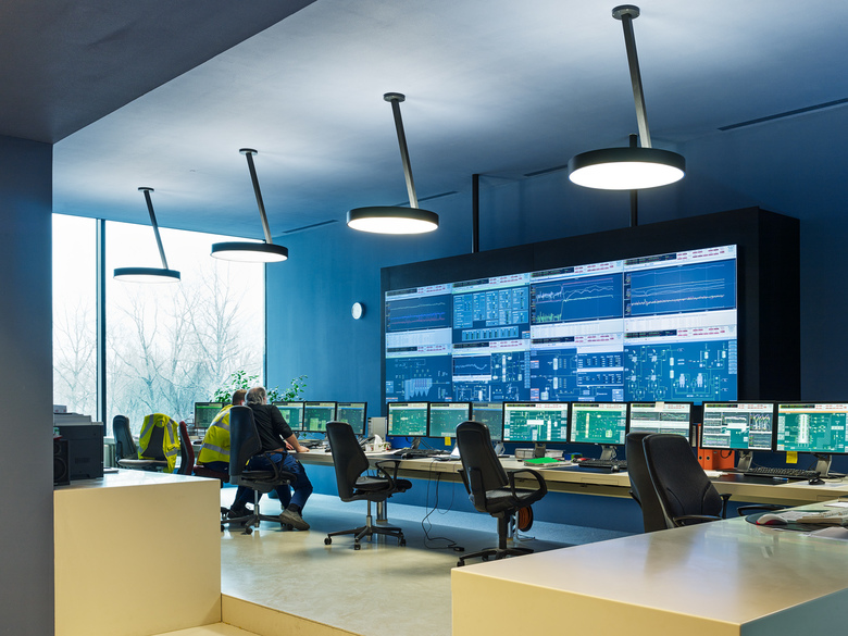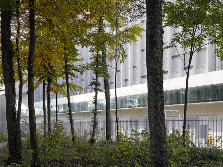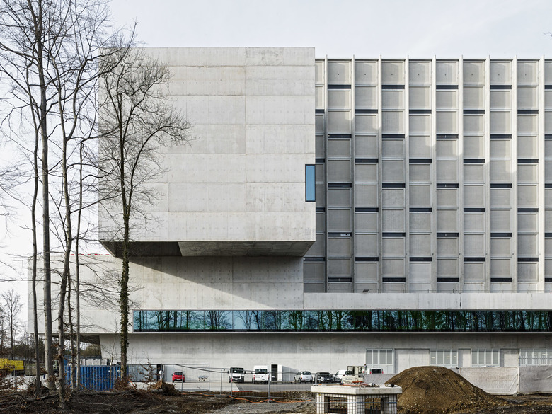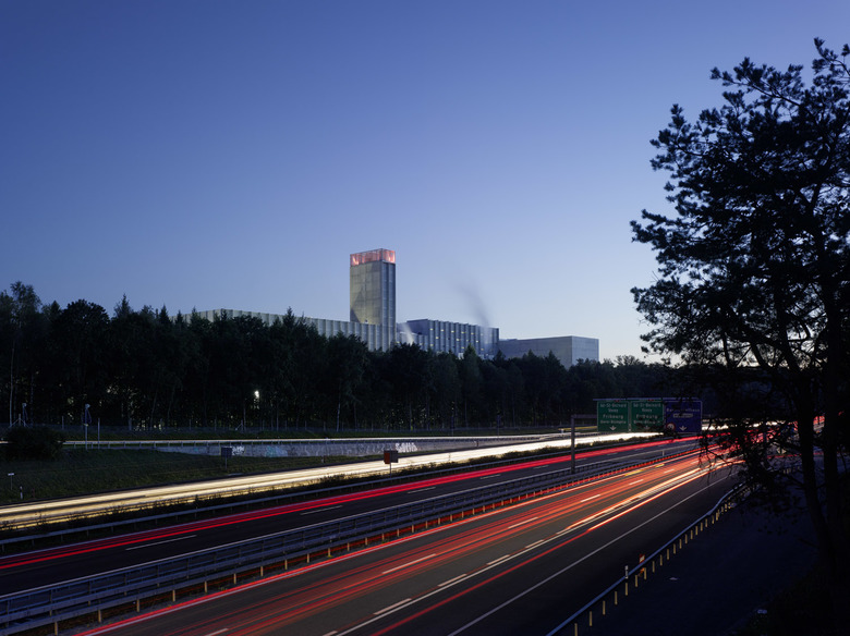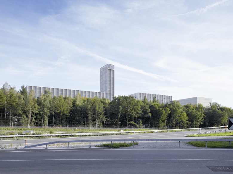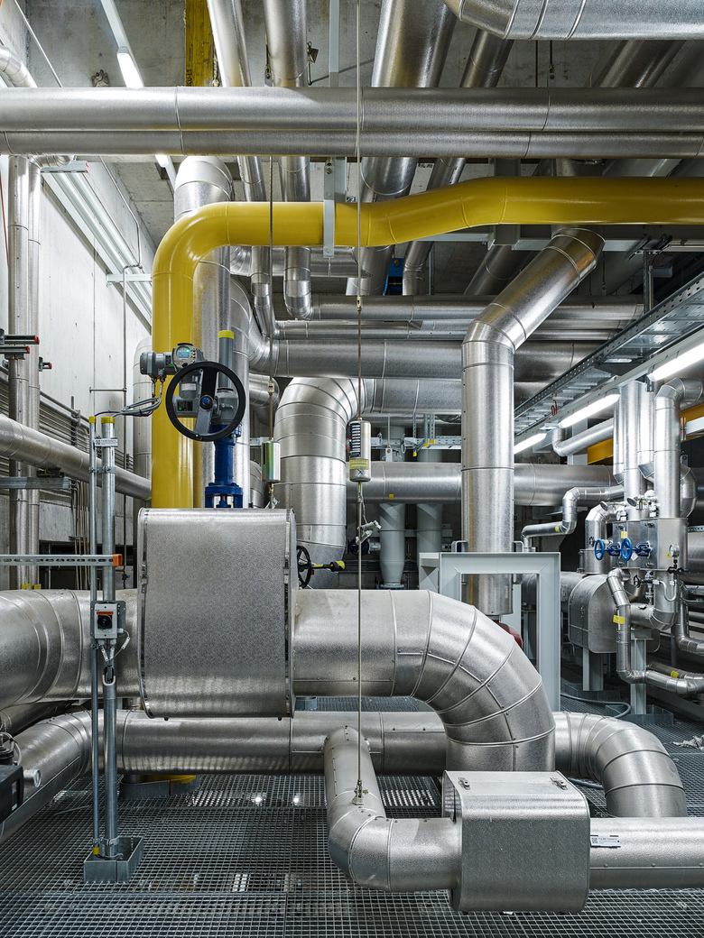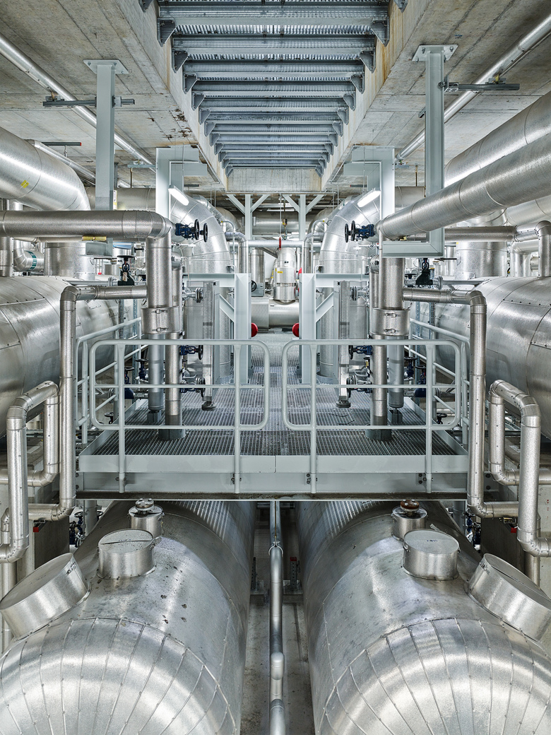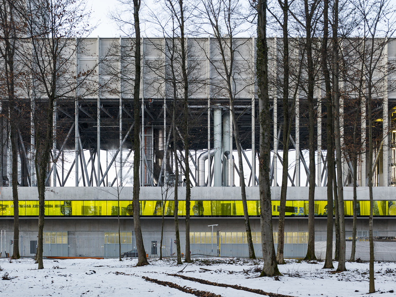 Ähnlich einem Containerfrachtschiff im Hafen liegt die Energiezentrale am Stadt-rand von Bern im Grossen Bremgartenwald. Die Anlage produziert Fernwärme und Strom mittels dreier Linien: Kehrichtverbrennung, Holzheizkraftwerk, Gas- Dampf-Kombikraftwerk / Um zukünftigen Anpassungen der Verfahrenstechnik gerecht werden zu können, muss die Konstruktionsweise des Gebäudes beständig, aber flexibel sein. Der Gebäudesockel und der Kehrichtbunker sind deshalb aus Ortbeton, die Hallen der Verfahrenstechnik als tektonische Hülle aus vorgefertigten Betonelementen konstruiert / Ein 300 m langer Besuchergang zieht sich entlang des gesamten Gebäudes. Durch gezielte Einblicke in den Verfahrensprozess und seine grosszügige Öffnung gegen den umliegenden Wald schafft er einen Bezug zwischen der „Maschine“ auf der einen und der Natur auf der anderen Seite.
