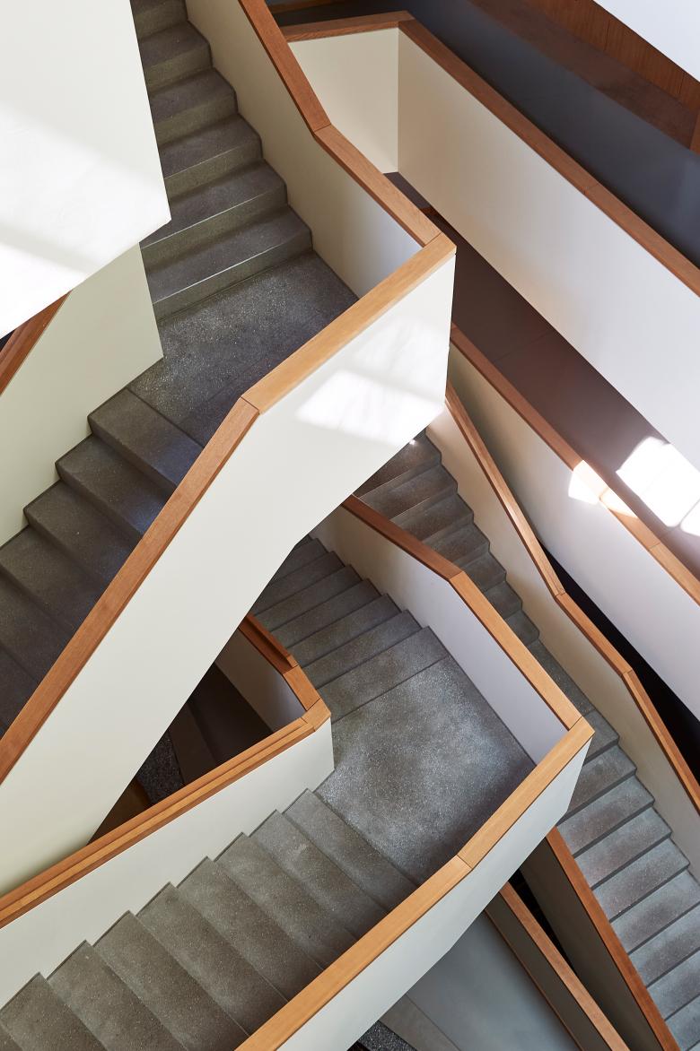 Mehrfamilienhaus mit 22 Eigentumswohnungen / Die unregelmässig fünfeckige Geometrie des Gebäudes entwickelt sich aus der Form der Parzelle und ermöglicht deren optimale Ausnutzung / Die attraktive Treppenanlage in der vertikal belichteten Erschliessungshalle verleiht dem Gebäude eine starke innenräumliche Identität / Alle Wohnungen sind übereck angeordnet und weisen geschlossene Zimmer und offene Wohnbereiche auf / Im Kontrast zum kristallinen und plastisch ausformulierten Binnenraum bestimmt das lichtdurchlässige weich geschwungene Gewebe aus Chromnickelstahl die äussere Erscheinung des Baus mit seinen geschwungenen, erkerartig ausgreifenden Loggien.
