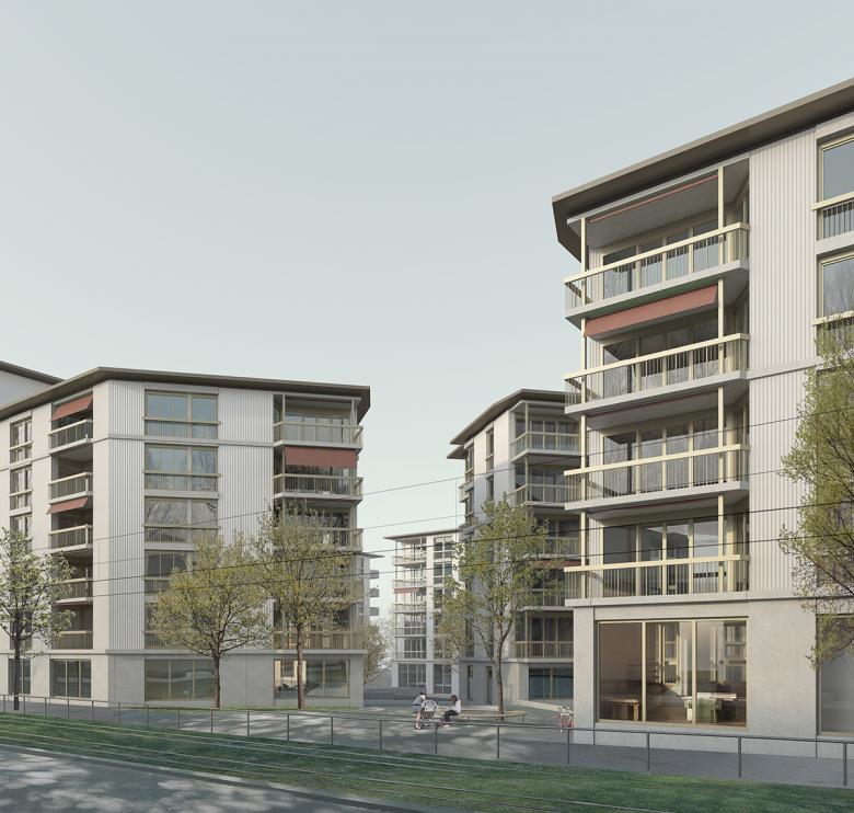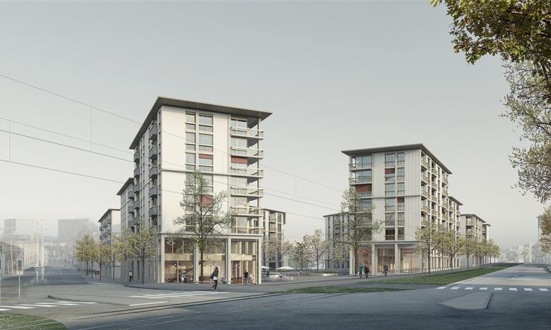 Nutzung: Siedlungsplatz, genossenschaftlicher Wohnungsbau (198 Whg.), Pflegeheime, Betreutes Wohnen, Alterswohnen, Kita, Grossverteiler, Büros, Gewerbe, Tiefgarage