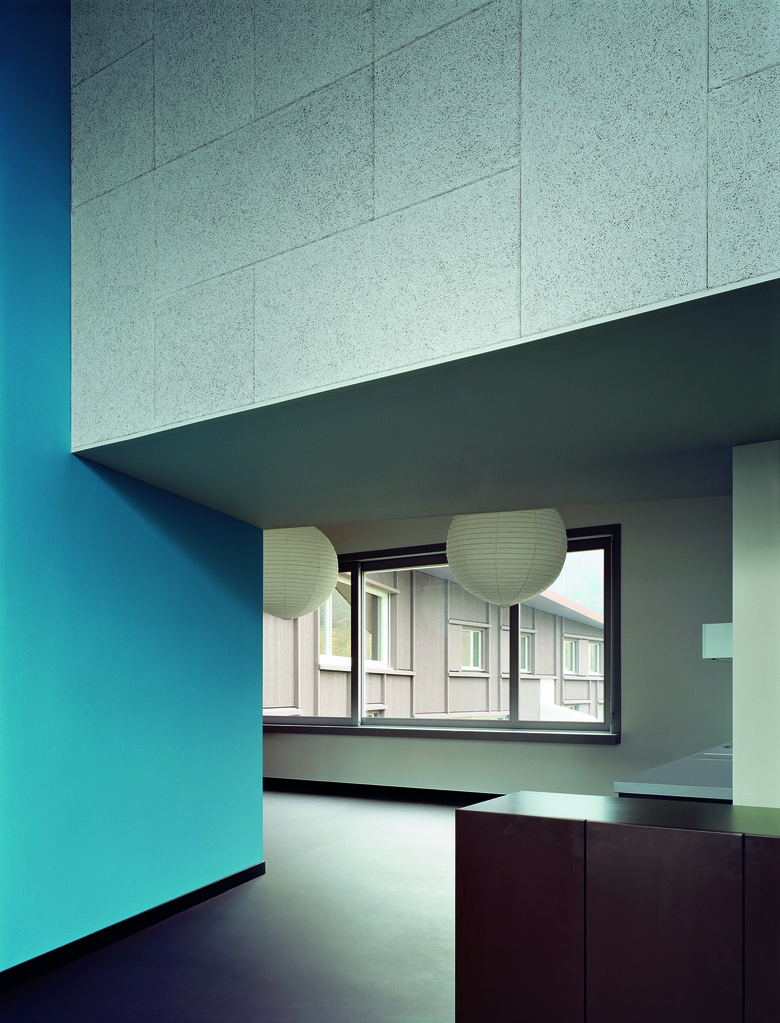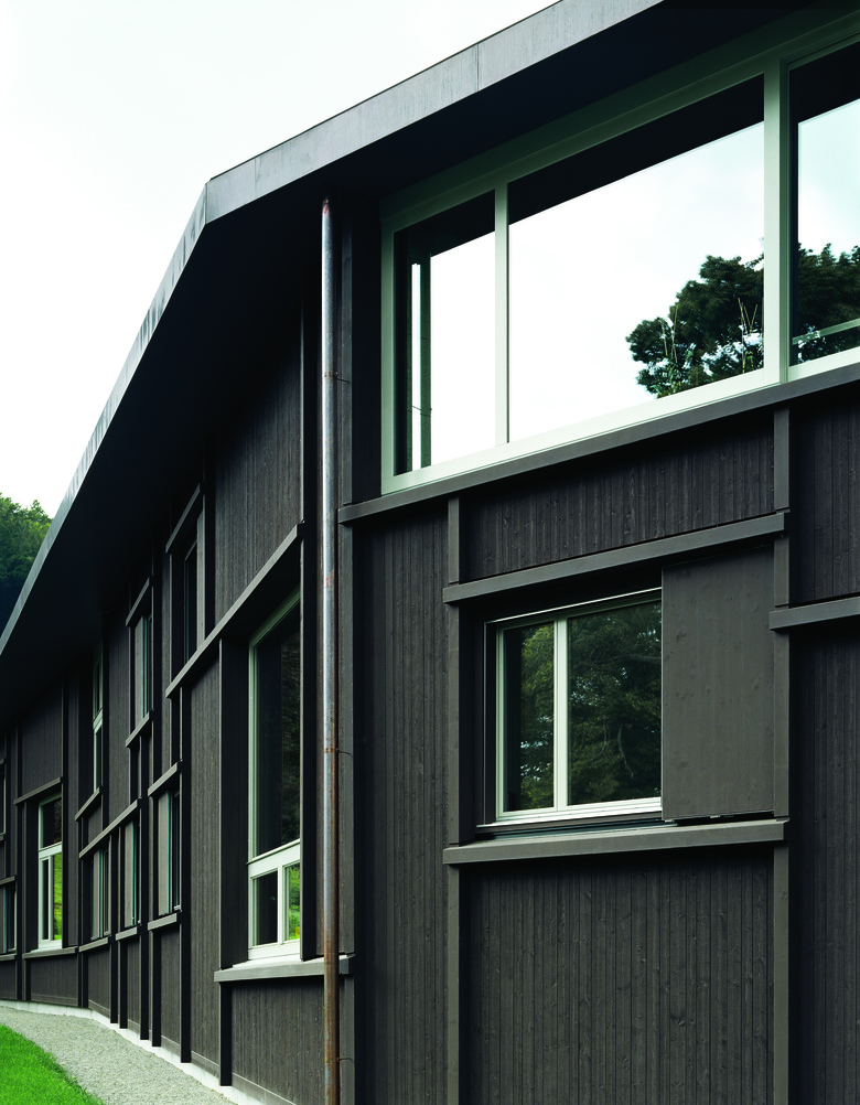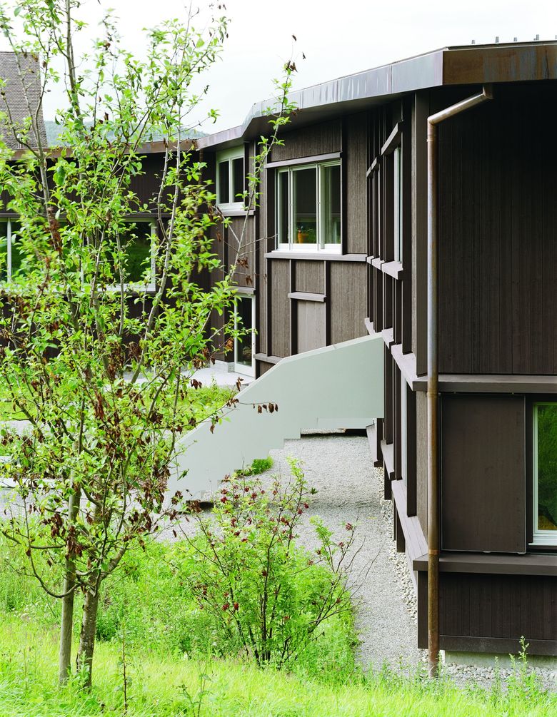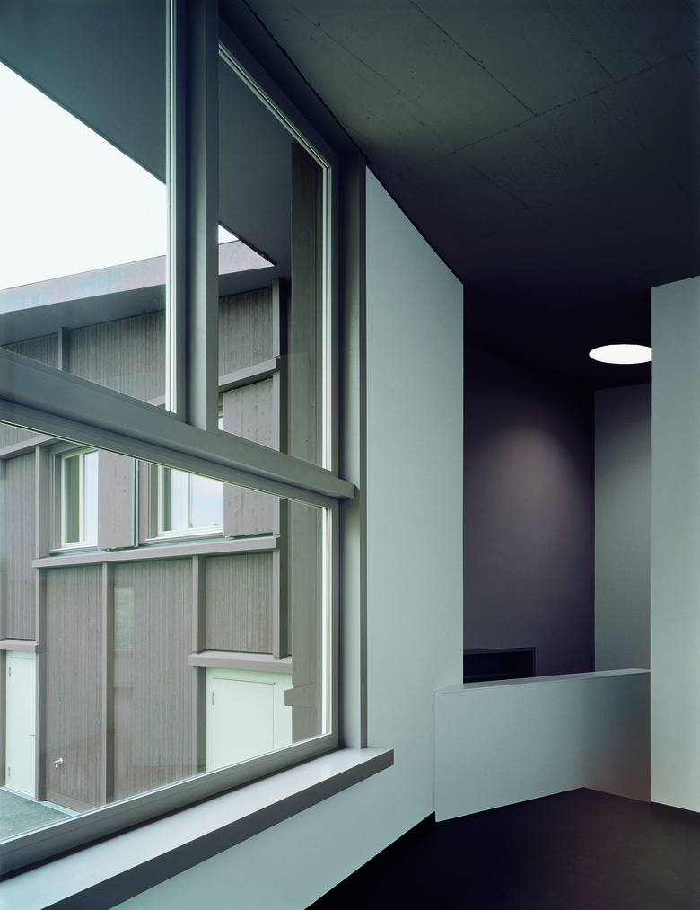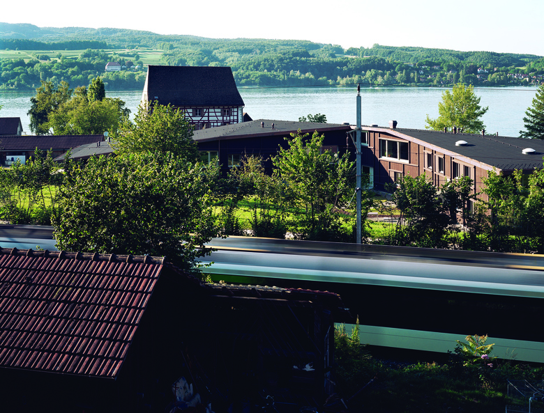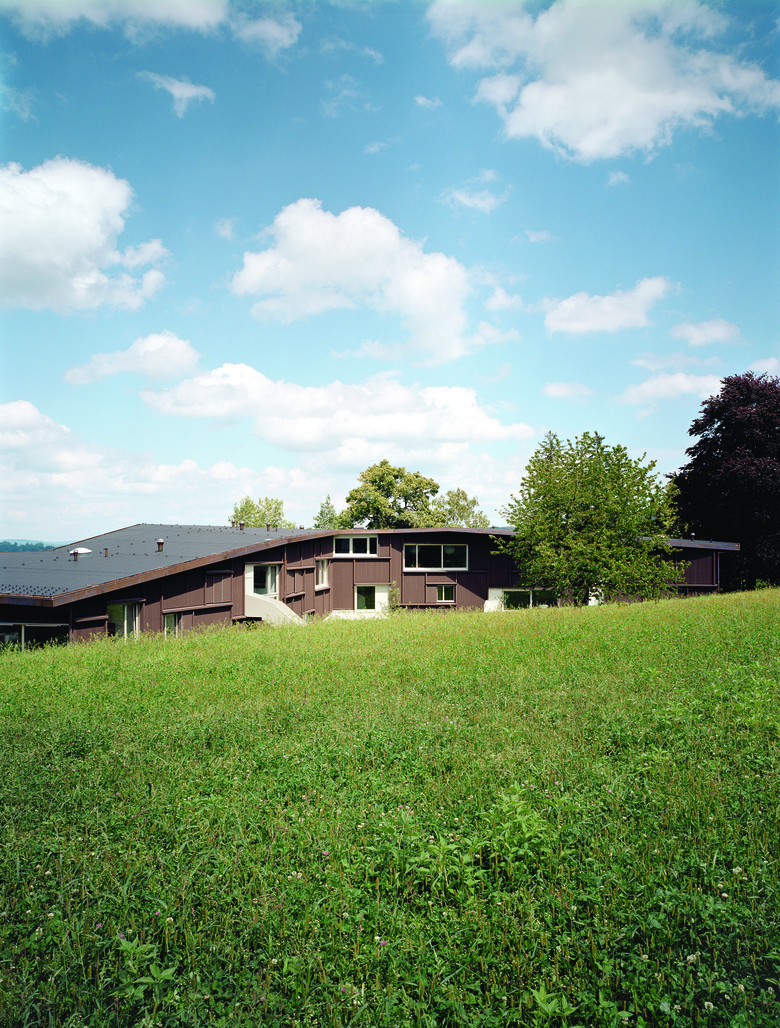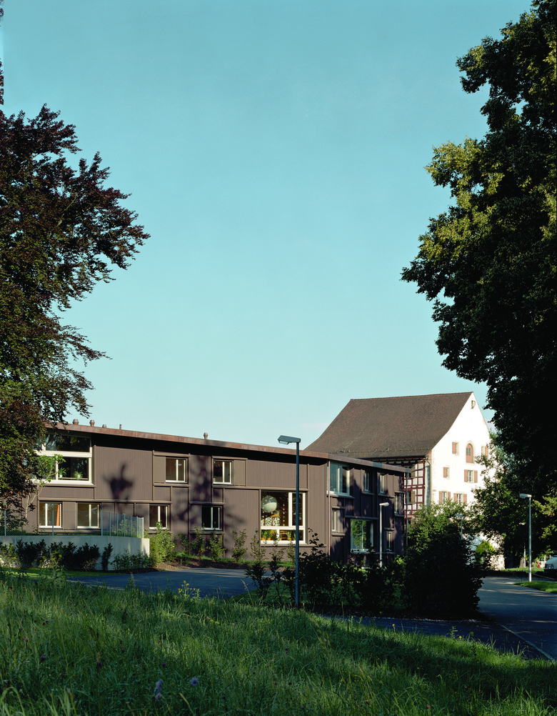 Wohnhaus für drei Gruppen von Jugendlichen mit Betreuern und Hauswart / Der ein- bis zweigeschossige Bau sekundiert das mittelalterliche Hauptgebäude und bildet über seine gewinkelte Figur einen Aussenraum mit seeseitigem Zugangsbereich und Garten im Süden / Zimmergruppen bilden drei Wohneinheiten aus und gliedern den offenen, gemeinschaftlich genutzten Wohn-, Ess- und Spielbereich / Vielfältige, diagonale Raumbezüge bieten allen Einheiten Sicht auf die anderen Wohngruppen, den See und den Garten / Die plastisch ausgebildete Holzfassade erinnert an ländliche Scheunenbauten oder einfache Unterkünfte wie Jugendherbergen.