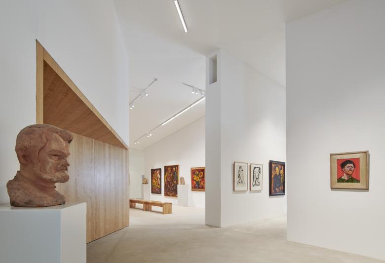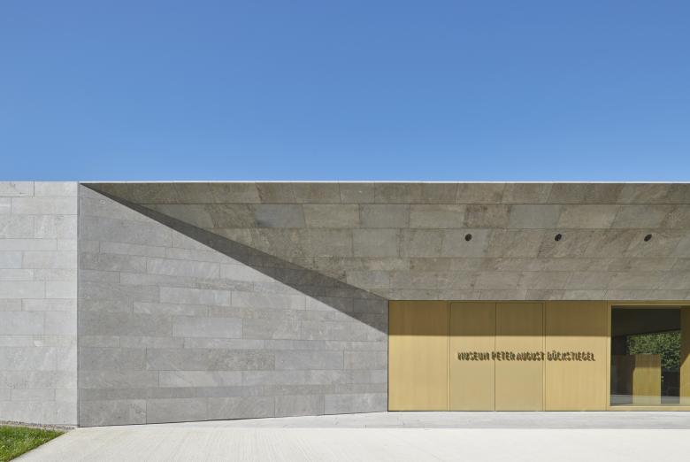 Peter August Böckstiegel (1889 – 1951) war ein deutscher Maler und Vertreter des westfälischen Expressionismus. Seine Werke sind von der intensiven Auseinander-setzung mit der bäuerlichen Lebenswelt seiner Heimat geprägt. In Nachbarschaft zu seinem Geburtshaus bettet sich der Neubau des Böckstiegel-Museums in das landwirtschaftlich geprägte Umfeld ein. Das Museum schält sich wie ein Findling, ein einzeln liegender, durch Naturgewalten geschliffener Stein aus dem Hang der Obstwiese heraus. Die Öffnungen sind plastisch in den Baukörper hineingeschliffen, bilden so überdachte Außenbereiche und orientieren sich zu den wichtigen Orten der Umgebung. Der Charakter eines aus dem Erdreich ragenden Felsbrockens wird durch die Fassade aus Muschelkalk und den fließenden Übergang in die Dachflächen unterstützt. Alle Fenster, Möbel und Einbauten sind aus heimischem Eichenholz gefertigt. Während sich der Baukörper in den Landschaftsraum hineinduckt, überrascht der fast kathedrale Ausstellungsraum mit seinen polygonalen Raumkanten. Der ergänzende Museumsbau vermittelt, formal abstrahiert, den für Böckstiegel so wichtigen Bezug zur Landschaft und zur bäuerlichen Arbeits- und Lebenswelt.