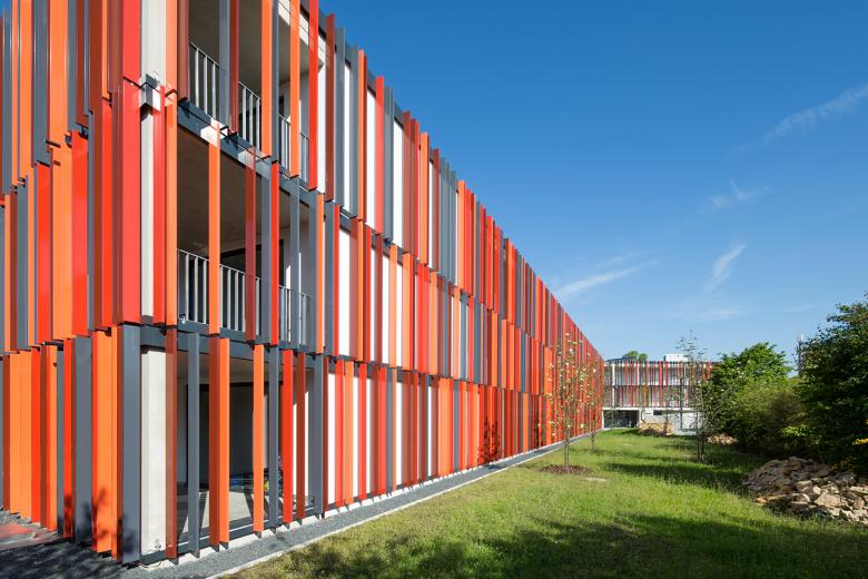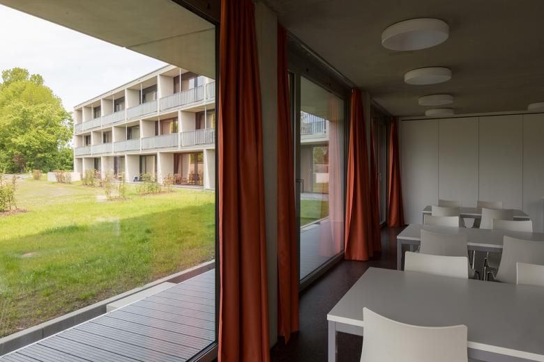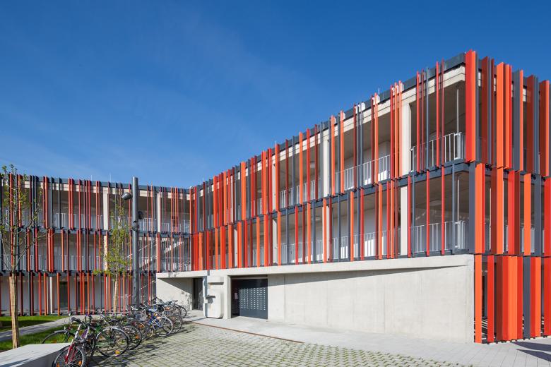 Der Entwurf stellt eine städtebauliche Reaktion auf das heterogene Umfeld und auf die längsgerichtete Grundstückssituation mit einer langgestreckten dynamischen Gebäudeform dar. Die klare Grundrissstruktur schafft übersichtliche Erschließungswege. Die horizontale und vertikale Erschließung erfolgt parallel zum Straßenraum. Ein Laubengang wird als zusätzlicher, halböffentlicher Gehweg verstanden – er ist Begegnungs- und Kommunikationsraum. Der zentrale Eingang mit den angrenzenden Gemeinschaftsräumen wird zum Mittelpunkt des Gebäudes. Auf jeder Ebene sind sowohl Einzel-Appartements und 2er-Wohngruppen als auch 3er-Wohngruppen als Gebäudeabschluss zu finden. Eine Tiefgarage und im Untergeschoss angeordnete Fahrradeinstellplätze sind klar von den Bewegungsflächen auf dem Grundstück getrennt.