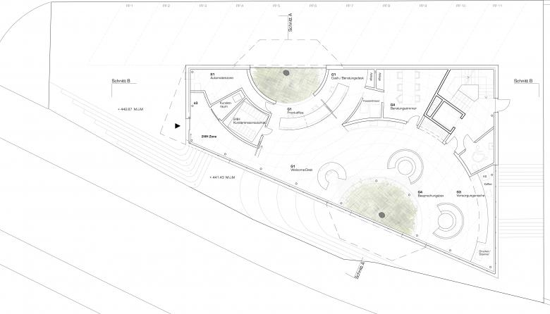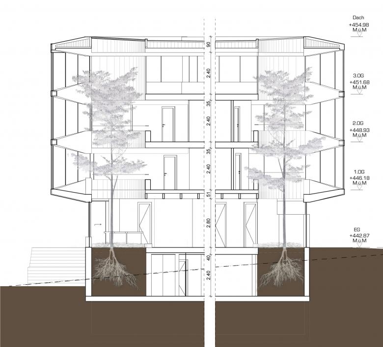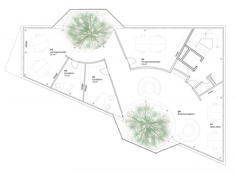Im Sinne einer authentischen und transparenten Sichtbarmachung des Kräfteverlaufs, wird die Betondecke über dem Erdgeschoss mit sichtbaren Unterzügen ausgebildet, welche den „Spannungstrajektorien“ einer Stahlbetondecke entsprechen. Die dabei resultierende Struktur entspricht der einer Zellstruktur eines Baumstamms (Stammquerschnitt), was die Analogie zum Konzept einer sichtbar, kraftvollen Natur unterstreicht.