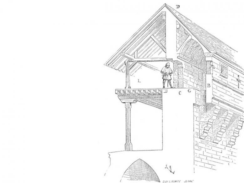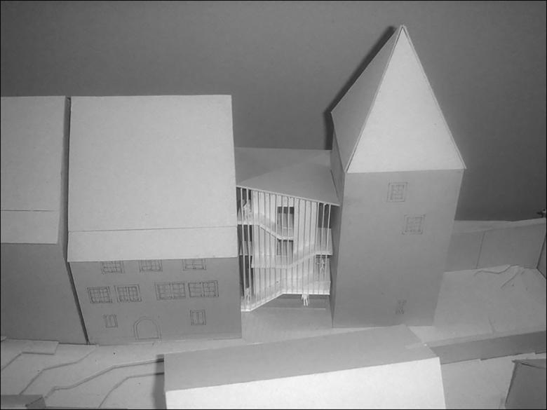Der Zwischenbau funktioniert als Verbindung zwischen den bestehenden Altbauten. Als Bauteil, der den Haupteingang zum Stadtmuseum Rapperswil- Jona aufnimmt. kommt ihm räumlich zudem eine zentrale Bedeutung zu. Er vereint also zentrale und dienende Funktion. Als Sekundärbau ausgebildet, lässt seine fein strukturierte Aussenhaut assoziationen mit einem Wehrgang oder dem ehemaligen Laubengang zu. Zum Breny- Turm hin duckt sich das Dach des Zwischenbaus, leitet von den Satteldächern der Gebäudezeile hinüber zum Turm, der dadurch optisch an Höhe gewinnt.