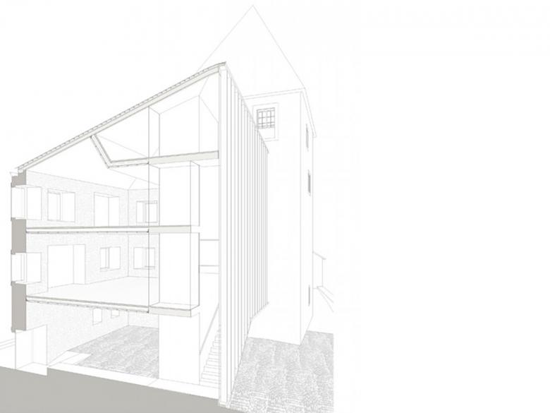Der neue fliessende Museumsrundgang ermöglicht ein abwechslungsreiches Pandeln zwischen dem sich zur Stadtseite hin öffnenden Treppenhaus und den eher introvertierten Ausstellungsräumen mit einer kontemplativen Seesicht in die Kempratner Bucht. Die neue Treppenanlage verlängert sich im obersten Lauf in den Estrichraum des Breny- Hauses und endet in einer "schwebenden", geschlossenen und beheizten Plattform, von der aus die mittelalterliche Dachkonstruktion und mögliche Exponate im Dachraum zu sehen sind. Der Lauf der Treppen wird in der Fassade sichtbar abgebildet, Diese Sichtbarkeit und Transparenz steht für das Grundkonzept des neuen Einbaus: als erkennbarer Erschliessungsbau dargestellt, soll er den Bestand zusammen mit dem Neubau zu einem neuen Ganzen verbinden, ohne ihre Eigenständigkeit zu konkurrieren.
