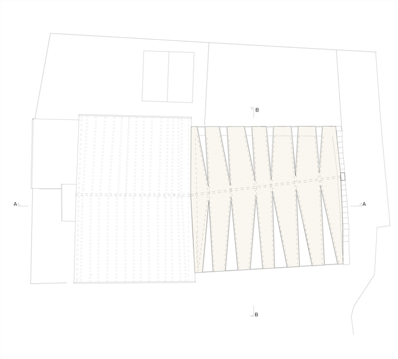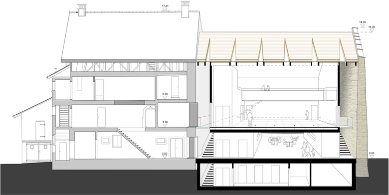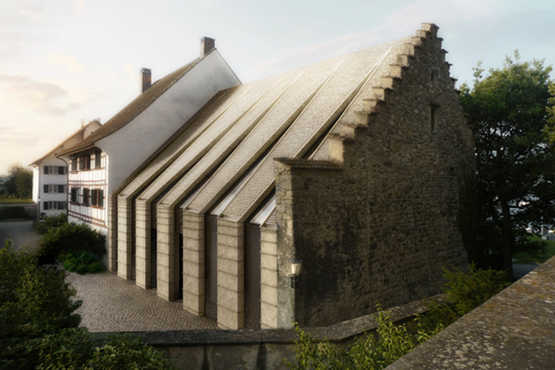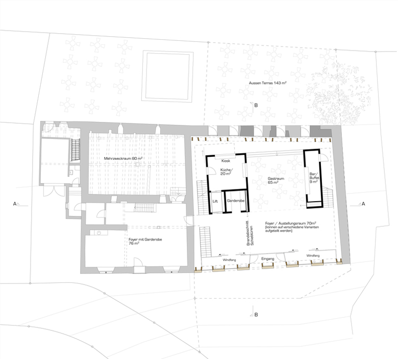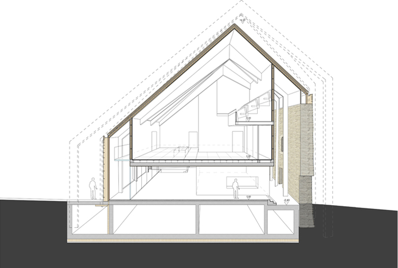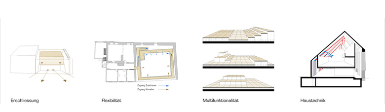 Der neue Saal wird im wahrsten Sinn als Kernstück in einer „Haus im Haus“ Konzeption unter der neuen Gebäudehülle eingebaut. Zenital belichtet und über zwei Seiten Erschlossen steht der neue Saal auf zwei Kuben und ist losgelöst von der primären Kreuzrippenkonstruktion. Die neue Aussenhülle besteht aus Lehm und Lehmziegel.
