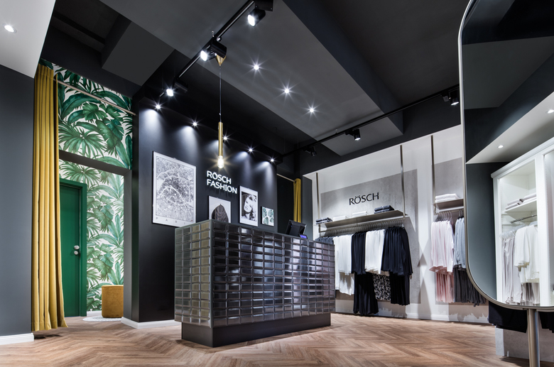Ebenfalls Senfgelb, ein samtiges, kubisches Sitzmöbel im Mittelraum sowie kleine, runde Hocker in den Umkleidekabinen. Palmentapeten setzen hier einen zusätzlichen visuellen Akzent - „Die reine Wohlfühlkunst“ findet sich in jedem Detail des neuen Rösch Fashion - Storedesigns.