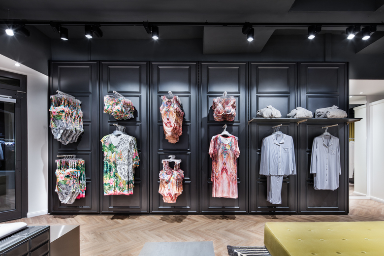 Es dominieren die Farben Anthrazit und Senfgelb. Aufwändig kassettierte Wandelemente sind eines der prägnanten Gestaltungselemente des neuen HEIKAUS-Designkonzeptes. Vor diesen werden die Bademoden und Homewearprodukte an dezenten Champagnerfarbigen Metallrahmenpräsentern dekorativ und zugleich funktional platziert. Die dunklen Rückwände setzen die farbenfrohe Mode dabei brillant in Szene. Aufgelockert wird die Warenpräsentation durch geputzte Wandsegmente, welche in Kombination mit Fachböden und Edelstahlrahmen, für Hänge-und Legeware genutzt werden können.