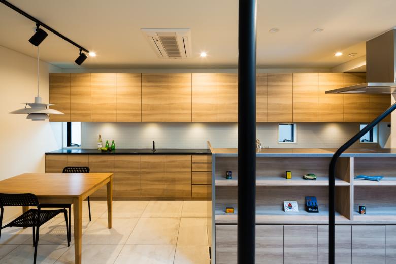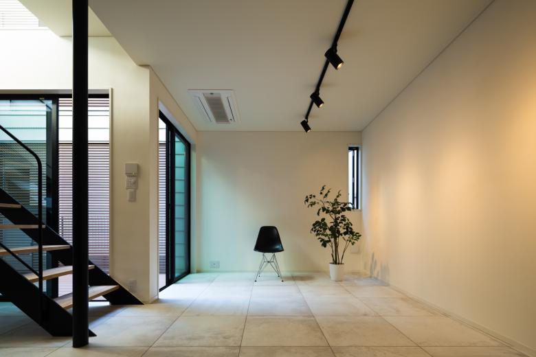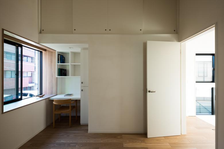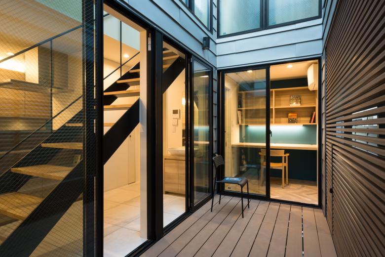 The exterior walls of the house are placed to the full extent of the site conditions, and a courtyard with a deck terrace is placed in the center of the wall, so that light and wind can be felt from anywhere in the deep interior space, and the ground floor has a flat access to the courtyard terrace. The courtyard terrace provides a good diagonal view and airy space, and at times creates a good distance between the family members across the courtyard terrace, a relationship that is important to each family member, and an expanse of space that is larger than the numerical value.