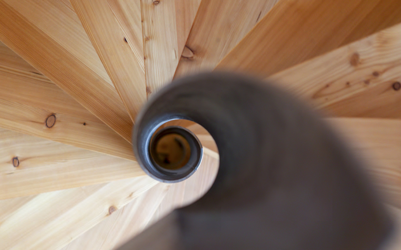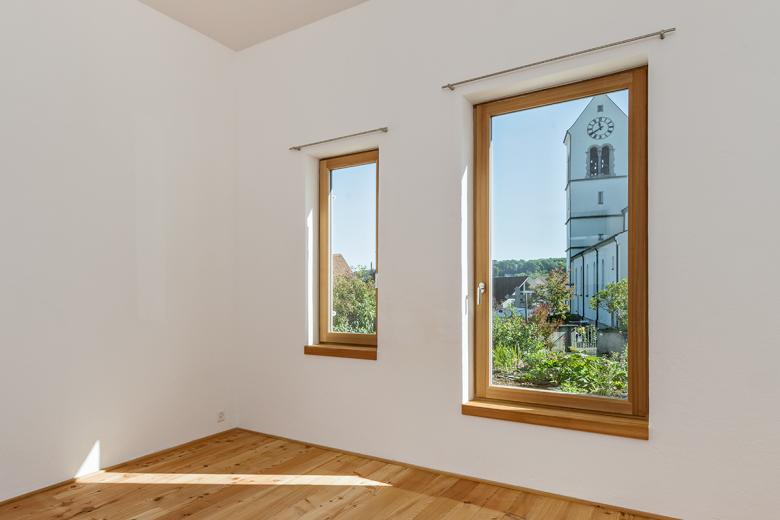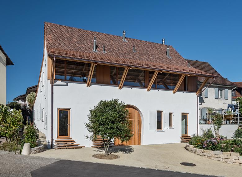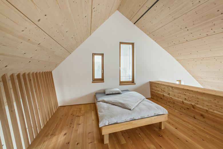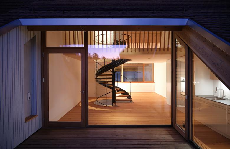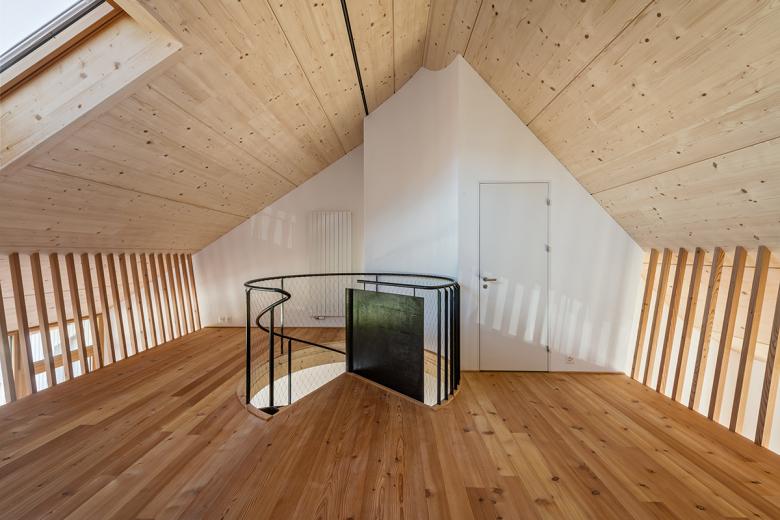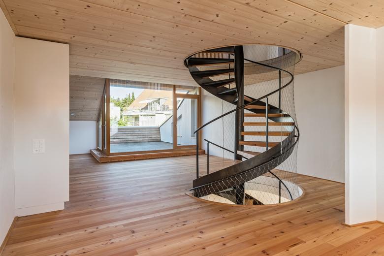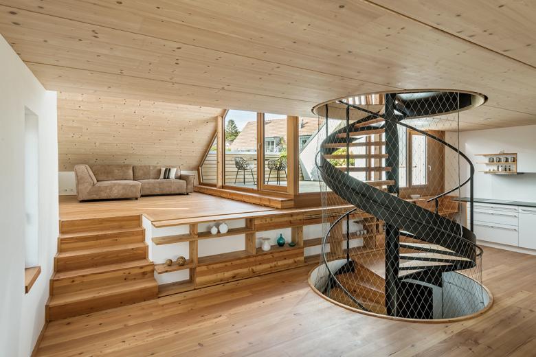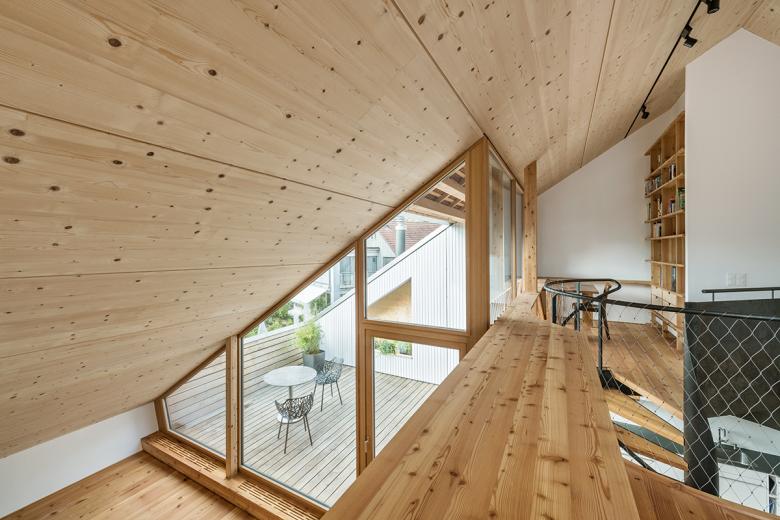 Das markante, nach hinten weit abgeschleppte Schrägdach prägt nicht nur das äussere Erscheinungsbild, sondern auch die drei ganz unterschiedlichen Wohnungen im Inneren.