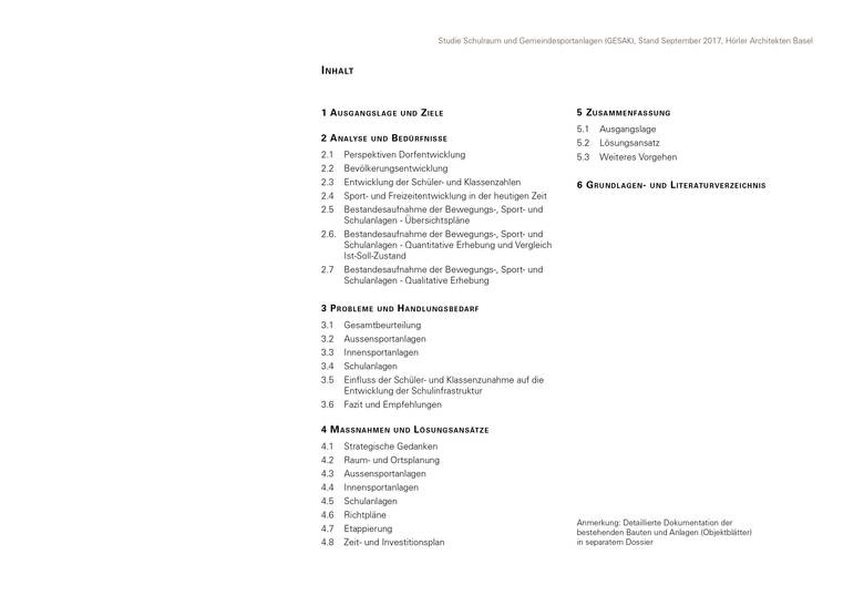 Zur Klärung von möglichen Lösungen sowie deren raumplanerischen, zeitlichen und finanziellen Realisierbarkeit hat die Gemeinde eine Machbarkeitsstudie in Auftrag gegeben, welche von Hörler Architekten in enger Zusammenarbeit mit Vertretern von Gemeinde, Sportvereinen und Schule erarbeitet wurde. Das daraus resultierende vorliegende Gemeindesportanlagenkonzept (GESAK) beinhaltet eine fundierte Bestandesanalyse, das Aufzeigen von Problembereichen und des Handlungsbedarfes sowie langfristige Lösungsansätze.