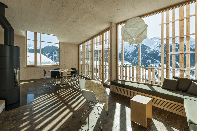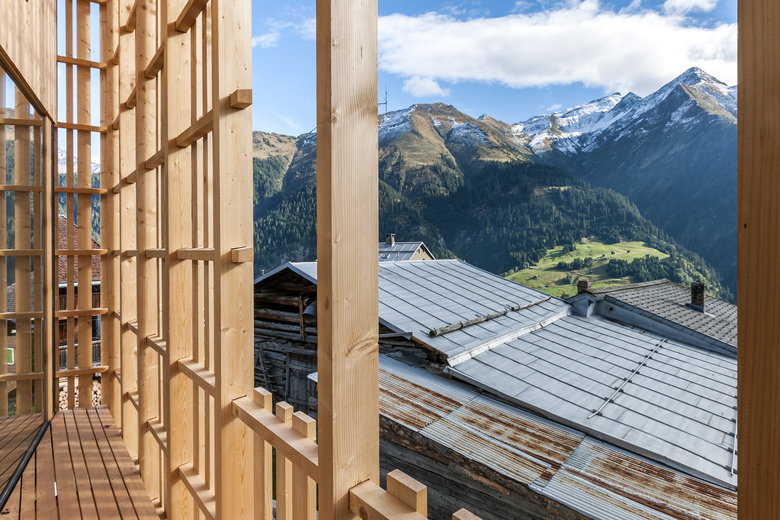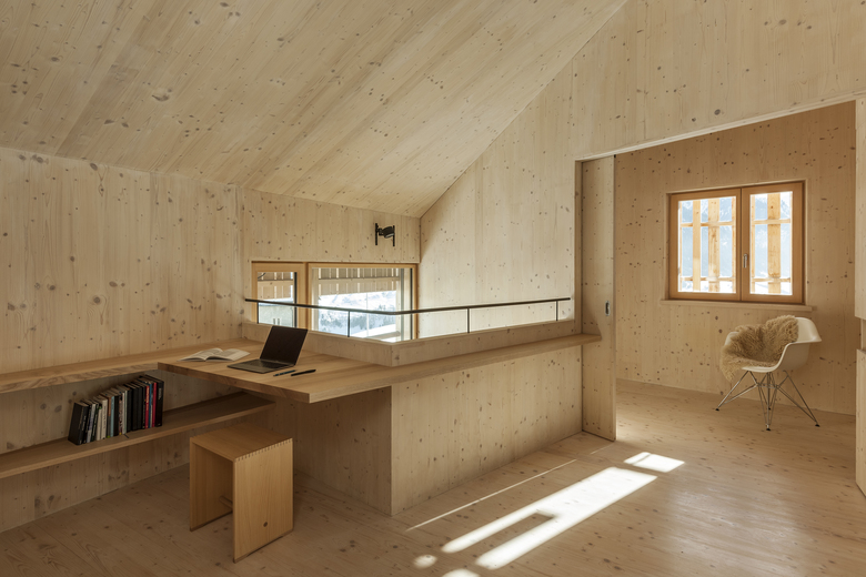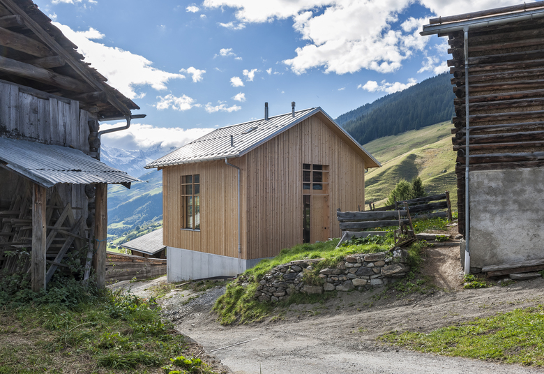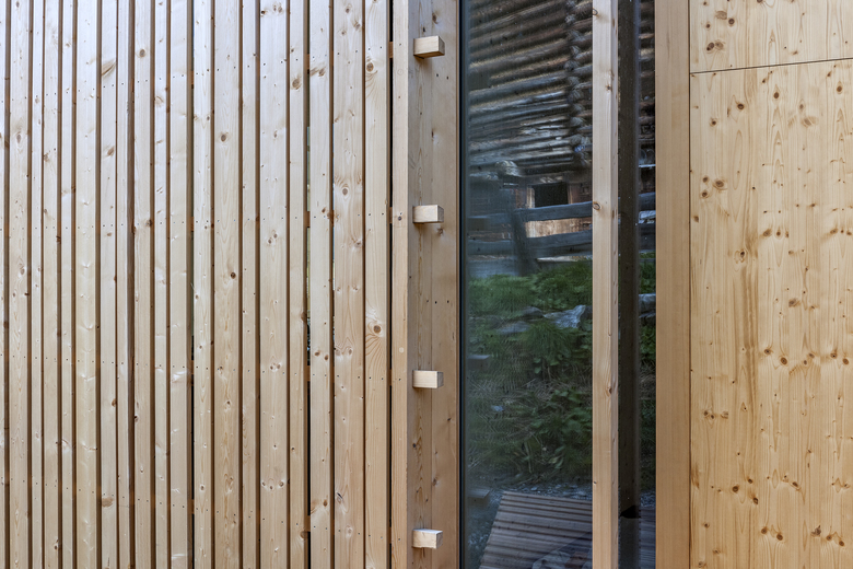 Der Massivholzbau entwickelt sich über einem Sockelgeschoss in Beton, welches hangseitig im Erdreich liegt und den konstruktiven Holzschutz gewährleistet. Die Auskragung der Laube gegen Süden ist wiederum ein typisches Element der lokalen traditionellen Bauweise.