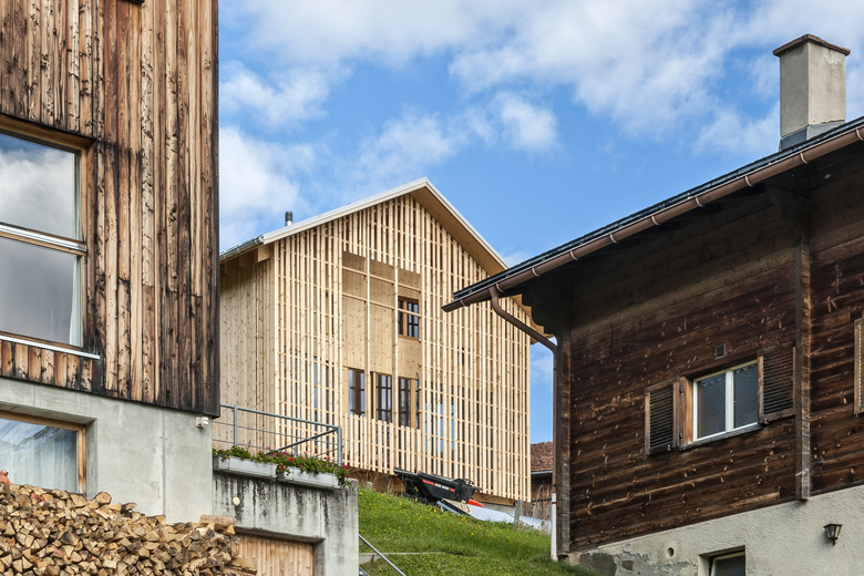 Lumbrein, ein Bündner Bergdorf im Val Lumnezia, liegt auf rund 1’400 M.ü.M. Das Dorfbild ist geprägt von traditionellen Holzbauten, insbesondere einer grossen Zahl an Ställen und Scheunen. Die ‚Casa Caninas’ integriert sich in die bäuerliche Umgebung und spiegelt in seiner Gebäudeform und Fassadengestaltung Elemente der sie umgebenden Ökonomiebauten wieder. So lehnen sich beispielweise die überhohen Fensteröffnungen - nur eine pro Fassade - an die Setzung und die Dimensionen der alten Scheunentore an. Für die Gebäudehülle wurde eine schlichte und unregelmässige offene Fichtenschalung gewählt, welche sich bei den Fensteröffnungen bis auf einige gezielte Strukturelemente auflöst und von innen her erlebbar ist. Die Art der Fassade erinnert an jene der alten Scheunen aus durchlüfteten horizontalen Rundbalken-Konstruktionen und unregelmässig darüber genagelten vertikalen Brettern. Auf der Südseite des Gebäudes tut sich die Fassade zu einer Laube auf, die Abstände der Schalungsbretter werden vergrössert. Früher diente die Laube, auch Histe genannt, mit ihren vorgesetzten senkrechten Pfosten und waagerechten Balken zum Trocknen von Heu oder Getreide. Hier dient die vorgelagerte Holzkonstruktion mit den traditionell durchgesteckten horizontalen Balken als Filter und wahrt gegen Aussen ein umlaufendes, einheitliches Fassadenbild. Die geschossbreite und -hohe Verglasung im Erdgeschoss liegt unauffällig in der zweiten Ebene. Die Laube selber dient als attraktiver, geschützter Aussenbereich.