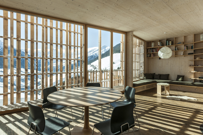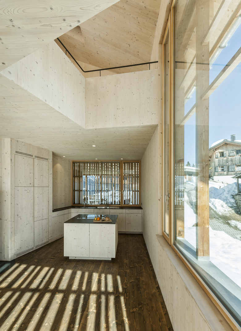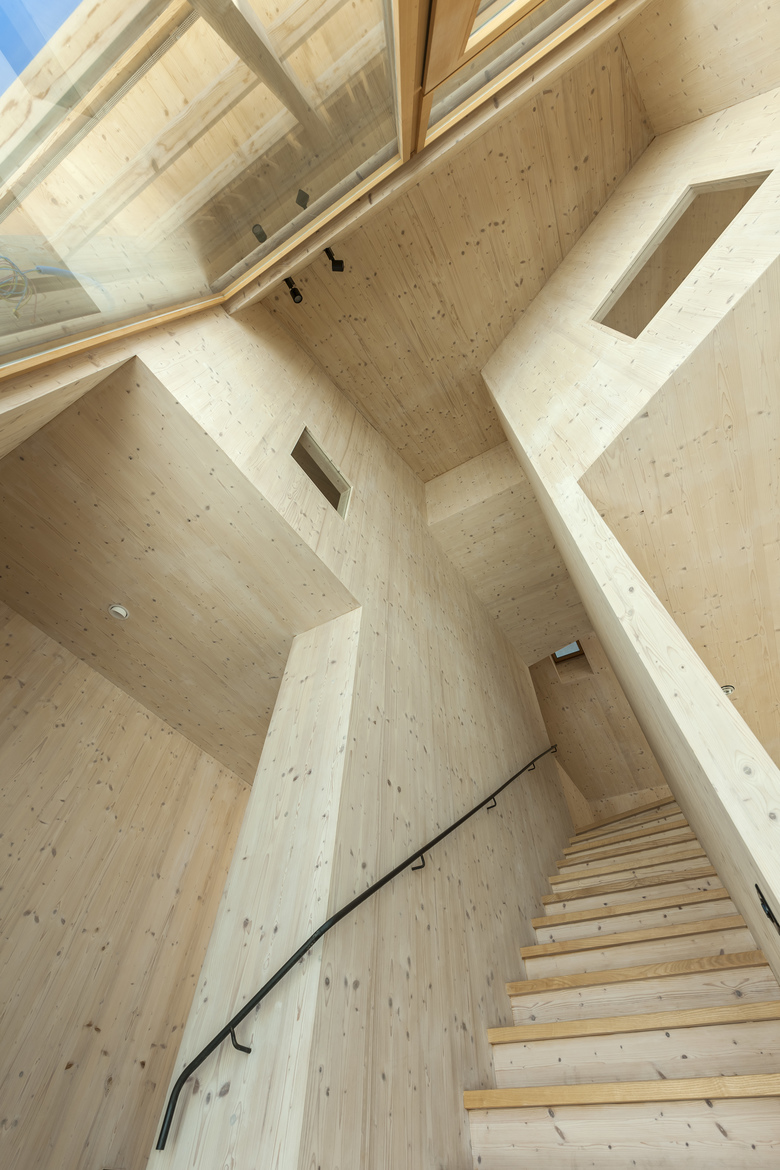 Das Gebäude ist komplett aus vorfabrizierten Ständer- und Massiv-Brettsperrholzelementen konstruiert. An den inneren Oberflächen werden die konstruktiven Fichtenmehrschichtplatten als fertige Oberfläche genutzt. Der hohe Massivholzanteil trägt zu einem angenehmen Raumklima bei. Die Konstruktionsweise mit Platten und deren CNC-Abbund ermöglichen skulpturale Formen, Öffnungen und Durchbrüche. Dies spiegelt sich in einer freien, polygonalen Grundrisseinteilung und insbesondere den Ausschnitten für die Lufträume hinter den zweigeschossigen Fensteröffnungen wieder. Das Holz ist durchgehend weiss geseift, einzig der Boden im Erdgeschoss wurde dunkel geölt.