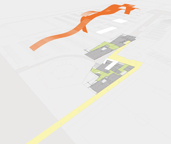 2. VDB ARGENT is a proposal for an office building on a corner site. The southern facade is protected using an aluminum screen and an external stair with gardens. This public realm is to be used by the tenants to get to the cafeteria on the roof.