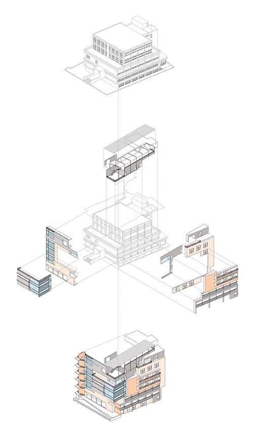 1. 69/70 RESIDENCY ROAD is an additions/alterations proposal. The existing building is being renovated to accommodate 70 hotel rooms on two additional floors. The diagram shows the assemblage of various elements addressing the program arrangement within and the response to the site's location in a dense urban locality.
