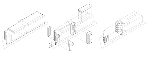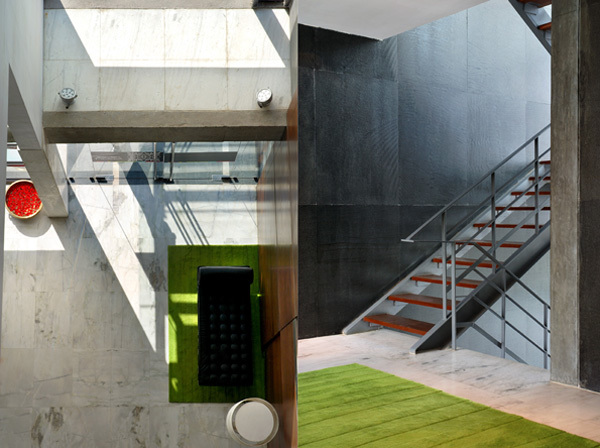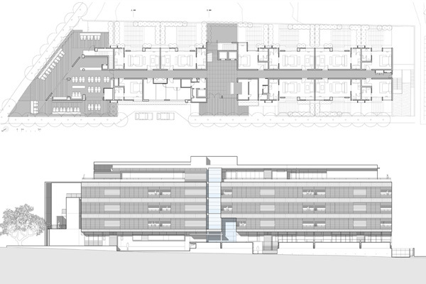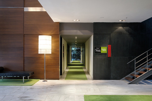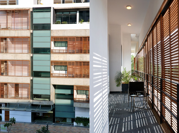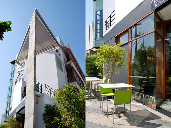 Seven Hotel is a 54 room business hotel on a narrow urban lot at the corner of a busy thoroughfare and a service road. The building addresses this corner condition with a series of stepped terraces. The long facades of the building face east and west and are protected by sliding timber screens. There is a patisserie at the ground floor which opens out to the street and a full service restaurant on the roof.