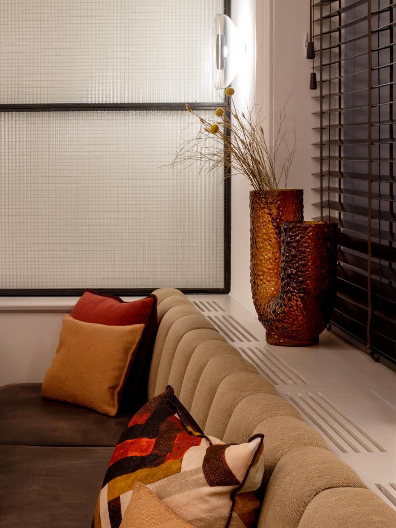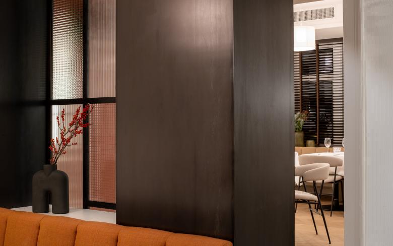 Der Kontrast mit einer kühlen Glaswand bringt Spannung in den Raum. Die Tische sind elegant eingedeckt, mit frischem Leinen und geschmackvoll arrangiertem Geschirr, was den Gesamteindruck noch verstärkt.