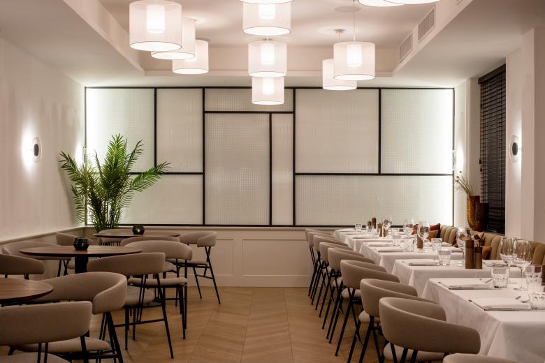 Es Bistro strahlt Wärme und Charakter aus, dank seiner durchdachten Materialien und Einrichtung. Die sanfte und verspielte Beleuchtung verbreitet ein warmes Licht und schafft eine intime und einladende Atmosphäre, in der die Gäste gerne speisen.
