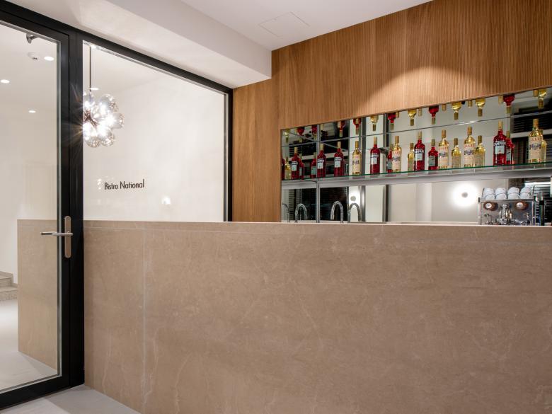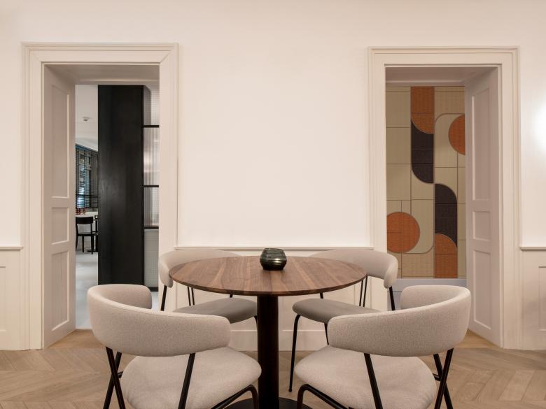 Um diese Vision zu ermöglichen, musste das Erdgeschoss des Hotels zum Teil grundsaniert werden. Unter Einbezug der Denkmalschutzbehörde ist ein schöner Raum entstanden, der das historische Ensemble einzigartig ergänzt.