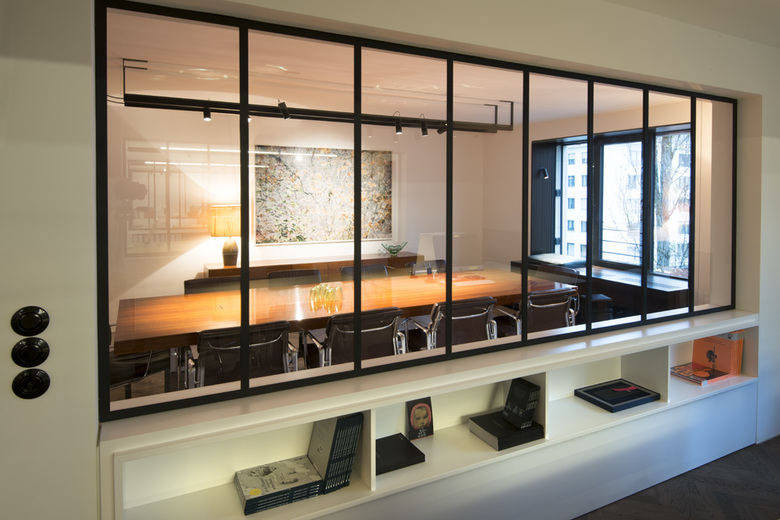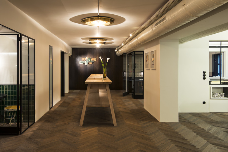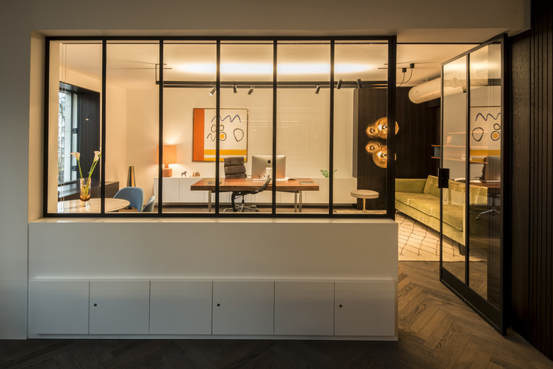 Die neuen Büroräume entstanden in der Leopoldstraße 25 in München im 3. Obergeschoss auf einer Fläche von ca. 300m2. Das Bestandsgebäude wurde komplett saniert und teilweise baulich erweitert. Der Bauherr wünschte sich ein stilvolles Objekt, das neben den technischen Voraussetzungen für den Ausbau auch Raum für Gestaltung und Individualität bietet. Handgearbeitete, schwarz lackierte Stahlrahmen-Glas-Elemente dienen als Trennung der verschiedenen Bereiche und Büros. Mögliche Blickbeziehungen und Kommunikationspunkte wie der große Stehtisch in der Mitte des Flurs sorgen trotzdem für eine offene Arbeitsatmosphäre. Rückzugsmöglichkeiten bieten der Besprechungsraum sowie die Telefonbox und die Küche. Fein aufeinander abgestimmte Materialien und ausgesuchte Möbel- und Accessoires im Stil der 60er Jahre bringen Wohnlichkeit und Wärme in die Räume. Durch hochwertige Materialien wie Messing und Marmor werden auch in den Sanitärräumen und in der Küche Akzente gesetzt. Um das einzigartige Büro-Konzept abzurunden wurde eine besondere Beleuchtung ausgewählt, die teilweise speziell für Mixtvision entwickelt und angefertigt wurde.