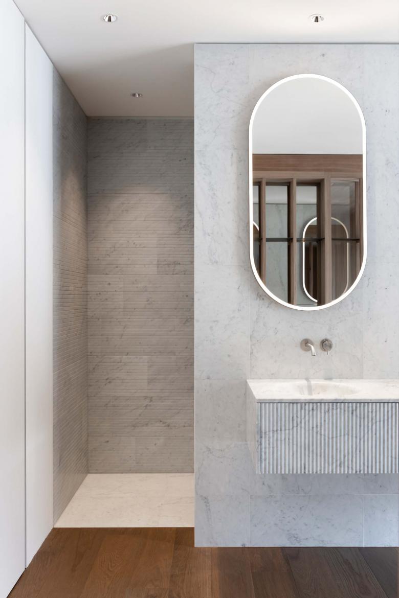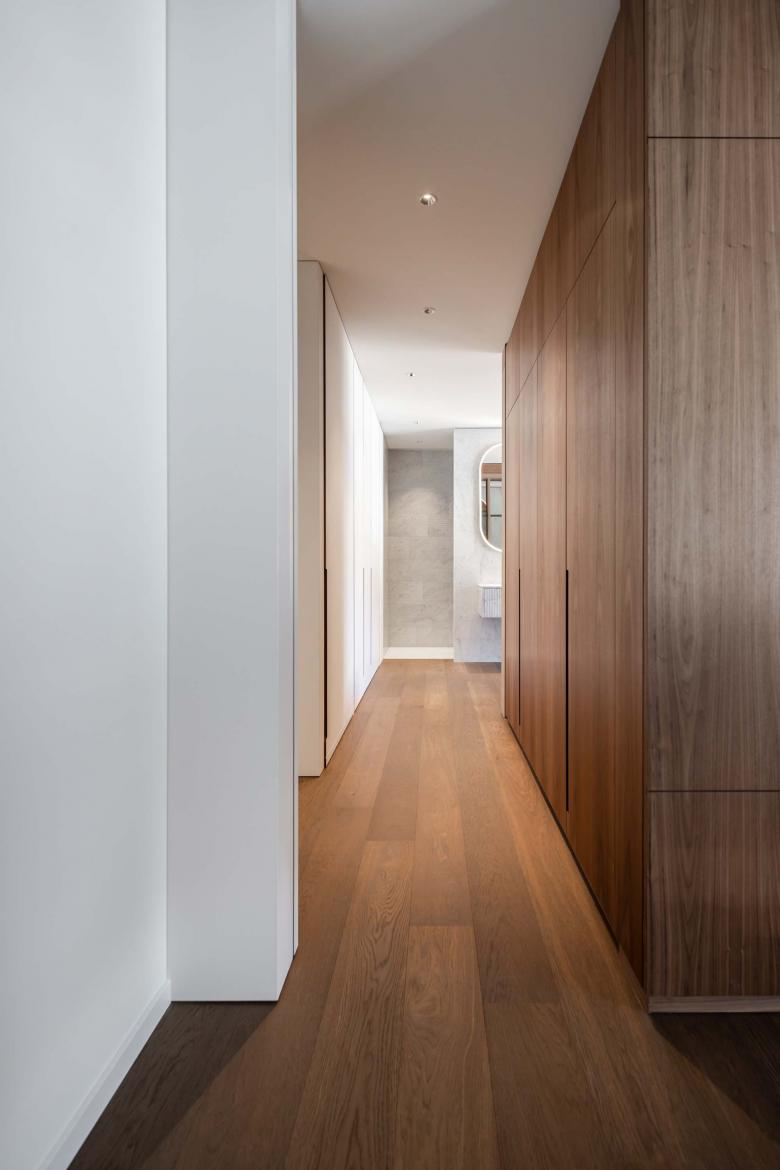 Als Gegenstück zum Block aus Stein im Wohnbereich entstand ein weiterer dominanter Materialkubus als Holz im Masterbad und -Schlafzimmer.