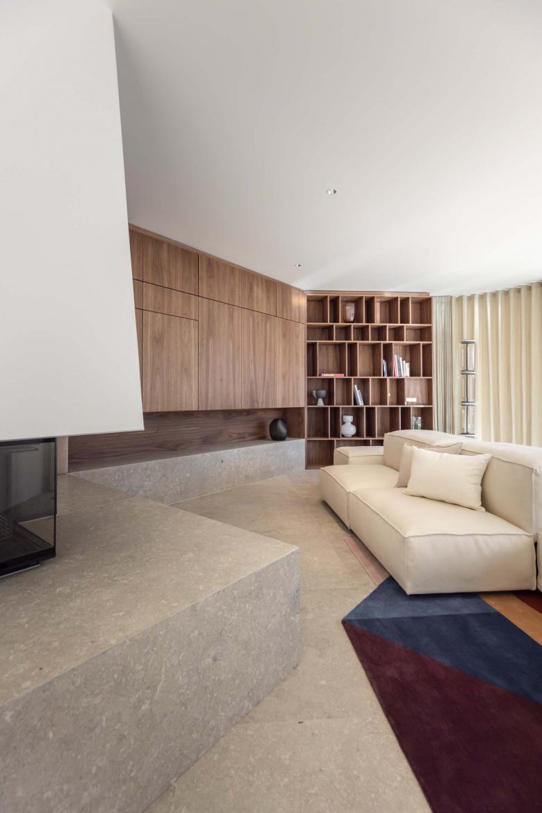 Der Grundriss war bereits ausgeklügelt; gemeinsam mit der Bauherrenschaft konnten wir den Stein als Boden im Wohnraum und als Wandverkleidung um den Aufzug herum durchsetzen, wodurch ein klarer Block geschaffen werden konnte.