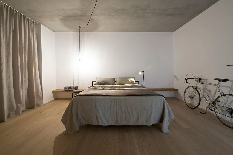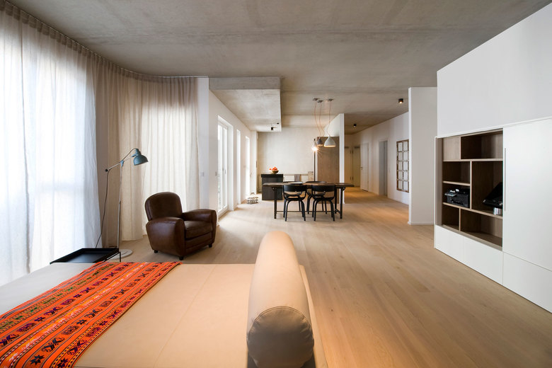An die Ansprüche des Kunden angepasst, entsteht eine großzügige Raumstruktur mit individualisierten Bereichen. Die Möblierung ist auf das Wesentliche reduziert. Gezielt ausgewählte Vintage-Elemente schaffen in Kombination mit schlichten, geradlinigen Objekten einen wohnlichen Charakter. Durch den bewussten Einsatz hochwertiger Materialien entsteht eine spannungsvolle Atmosphäre. Individuelle Schranklösungen bieten viel Stauraum. Ohne sich aufzudrängen, fügen sie sich in das geradlinige BIld ein und überraschen mit besonderen Details..