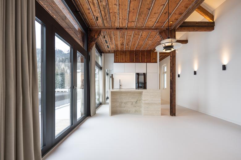 Die seltene und schön erhaltene Holzdecke, sowie die verzierten Holzstützen wurden bewahrt und schaffen so nun einen spannenden Kontrast zu dem modernen, offenen und minimalistisch gestalteten Raum.