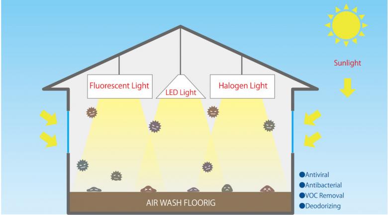 ikutaのエアー・ウォッシュ・フローリングは画期的な新技術「暗所対応型の最適化複合光触媒」を採用。 床に付着するウイルス・菌・VOC(シックハウスの原因物質)・臭いの原因物質を除去する 独自の複合フローリング材です。 自然の光はもちろん、室内照明が当たるだけで、触媒作用が働き、効果を発揮します。 しかも効果は半永久的に持続します。
