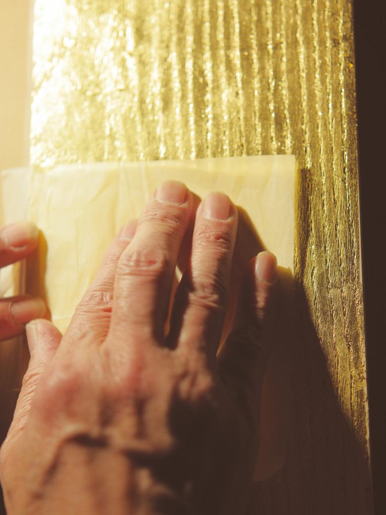 温もりある輝き。金沢と西陣、ふたつの箔の伝承技術とのコラボによる箔フローリング。匠たちが丹誠込めた伝統工芸を、足裏に感じられる幸せ。温もりのある輝き放つ箔フローリング。