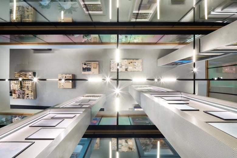 Außenwirkung in Richtung Marktplatz erzeugt außerdem ein hoher Luftraum im Inneren, der sich vom i-Punkt im Erdgeschoss in die erste Etage öffnet. Ikonische Stelen gliedern den Bereich und vergrößern den Raum in der Vertikalen, eine Wirkung, die durch die Spiegeldecke darüber dramatisch verstärkt wird. Auf ihren dem Markt zugewandten Seiten werben die Stelen mit großformatigen Motiven für die Attraktionen der Region. Auf der Rückseite schaffen Regalsysteme einen ruhigen Rahmen für die Vielfalt an Informationsmaterial.