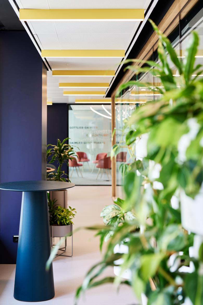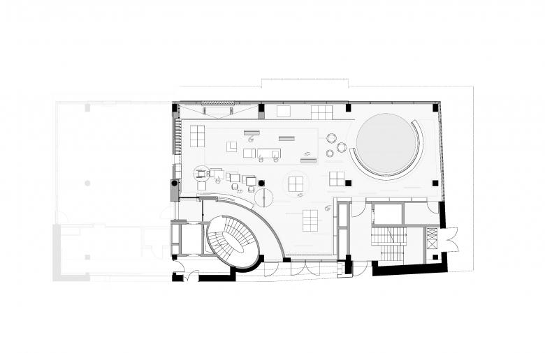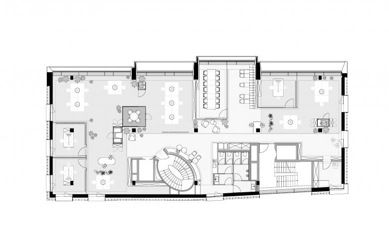 Die auf drei Geschosse verteilten Arbeitswelten der Stuttgart Marketing GmbH und des Tourismus Marketing GmbH Baden-Württemberg (TMBW) bieten ein breites Angebot für unterschiedliche Modi der Arbeit: von konzentriert und kreativ bis kollaborativ und kommunikativ. Um den ovalen Treppenhauskern, ein Relikt des Bestandsgebäudes, sind auf allen Etagen die Teeküchen und Pausenbereiche organisiert. In die ovale Rückwand sind jeweils ein Alkoven und ein setzkastenartiges Regal integriert. Im Regal werden verschiedene Objekte präsentiert, die einen eigenen Erzählstrang als verbindendes Element über die Etagen eröffnet.