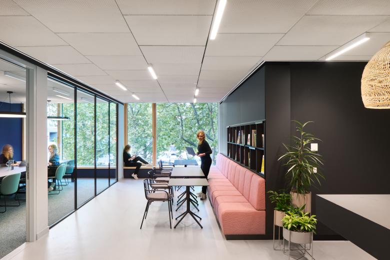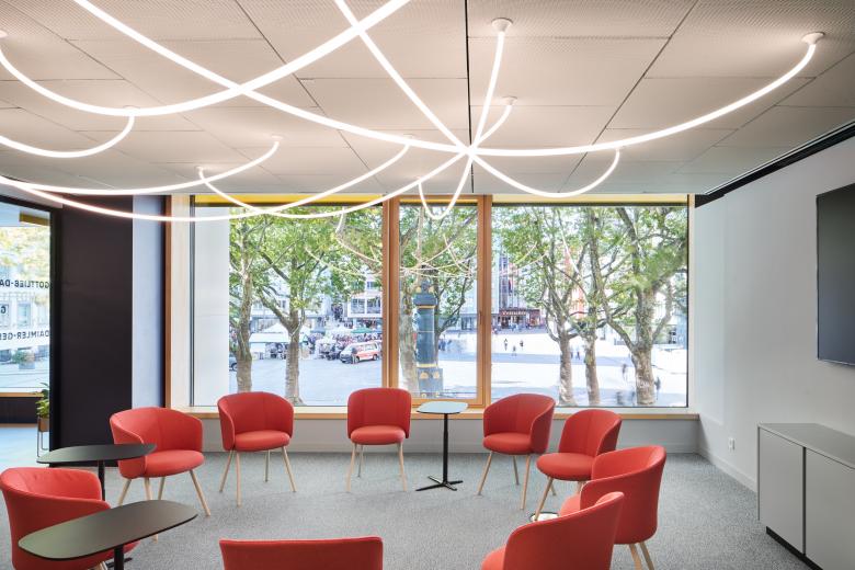 Vom i-Punkt aus blickt man durch die Verglasung des offenen Atriums in die Flächen der ersten Etage. Dort werden Besprechungs-, Workshop- und Veranstaltungsräume sichtbar. Diese sind Bestandteil der Arbeitswelten für Stuttgart Marketing, werden aber auch an externe Interessierte vermietet: Denn das Haus des Tourismus versteht sich als offenes Haus mit Angeboten für eine breite Nutzung. Die drei mietbaren Flächen sind unterschiedlich konfiguriert. Allen gemein ist der herrliche Ausblick auf das Treiben auf dem Marktplatz. Farb- und Materialwelt sind aus den Corporate-Farben der Stuttgart Marketing GmbH abgeleitet und bieten damit ein Identifikationsmoment für die Mitarbeitenden.