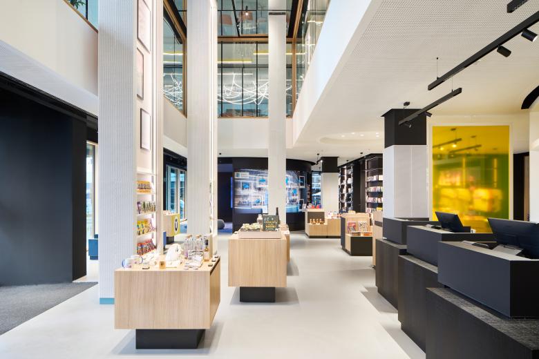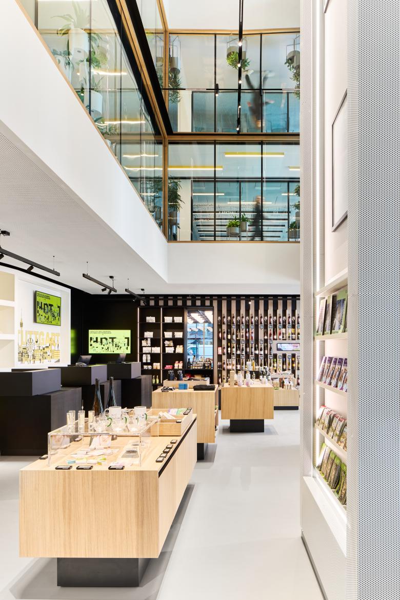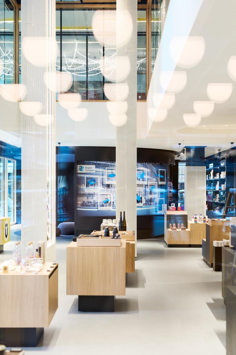 Die Touristinfo ist das Herzstück des Gebäudes und ein klarer Identitätsstifter. Die gesamte Präsentation der Produkte wie der Infomaterialien wird in eine einheitliche wie eindrückliche, nach außen hin ablesbare Form mit starkem Absenderverhalten und hohem Kaufimpuls nach innen übersetzt. Digitale und analoge Medienflächen werben für Stuttgart, die Region und das Urlaubsland Baden-Württemberg. Die Bereiche für Information, Verkauf und die Angebote der Markenpartner sind klar gegliedert. Durch die flexiblen Präsentationsmöbel lässt sich der Raum schnell verändern und weiterentwickeln.