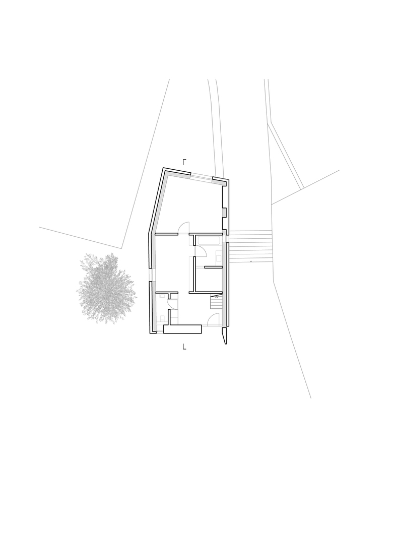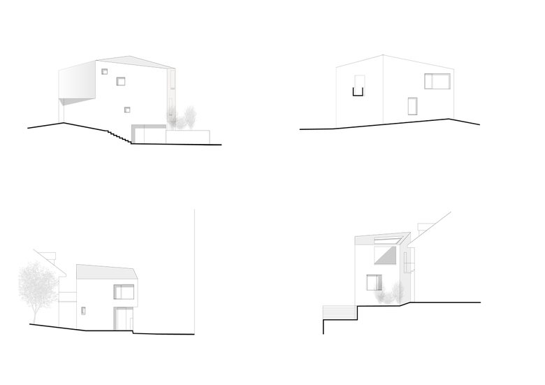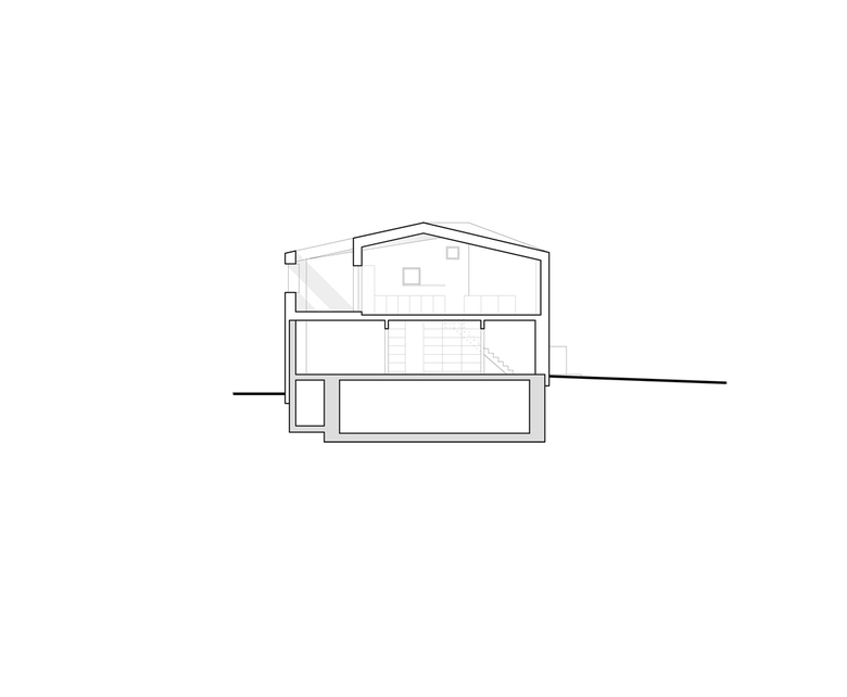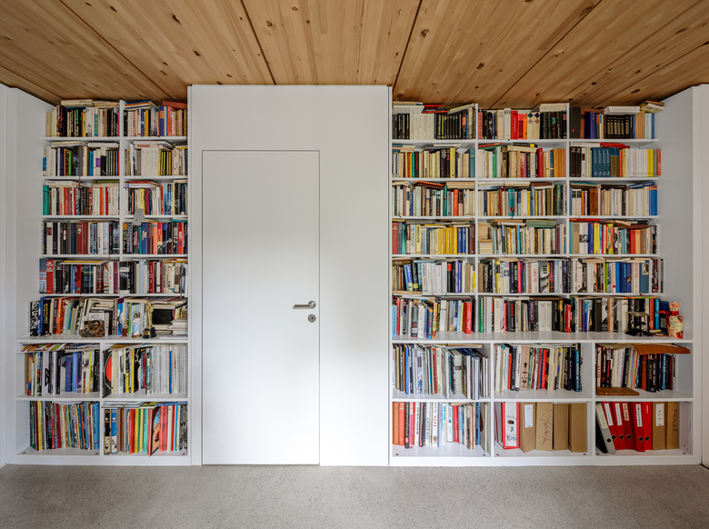 Im massiven Bestand des Erdgeschosses liegen das Schlaf- und Badezimmer, sowie eine kleine Bibliothek. Der an einer Stelle leicht auskragende Überbau wird äußerlich mit dem Bestand verschliffenein durchgängig eingefärbter, hochwertiger Verputz lässt so eine neue, eigenständige und kräftige Figur entstehen, die sich im dispersen Umfeld behauptet. Ein Minimum an ökonomischem Aufwand, unter Einsatz einer ökologischen Bauweise, führt zu einem neuen Ganzen und einem Maximum an baulicher und sozialer Verdichtung.