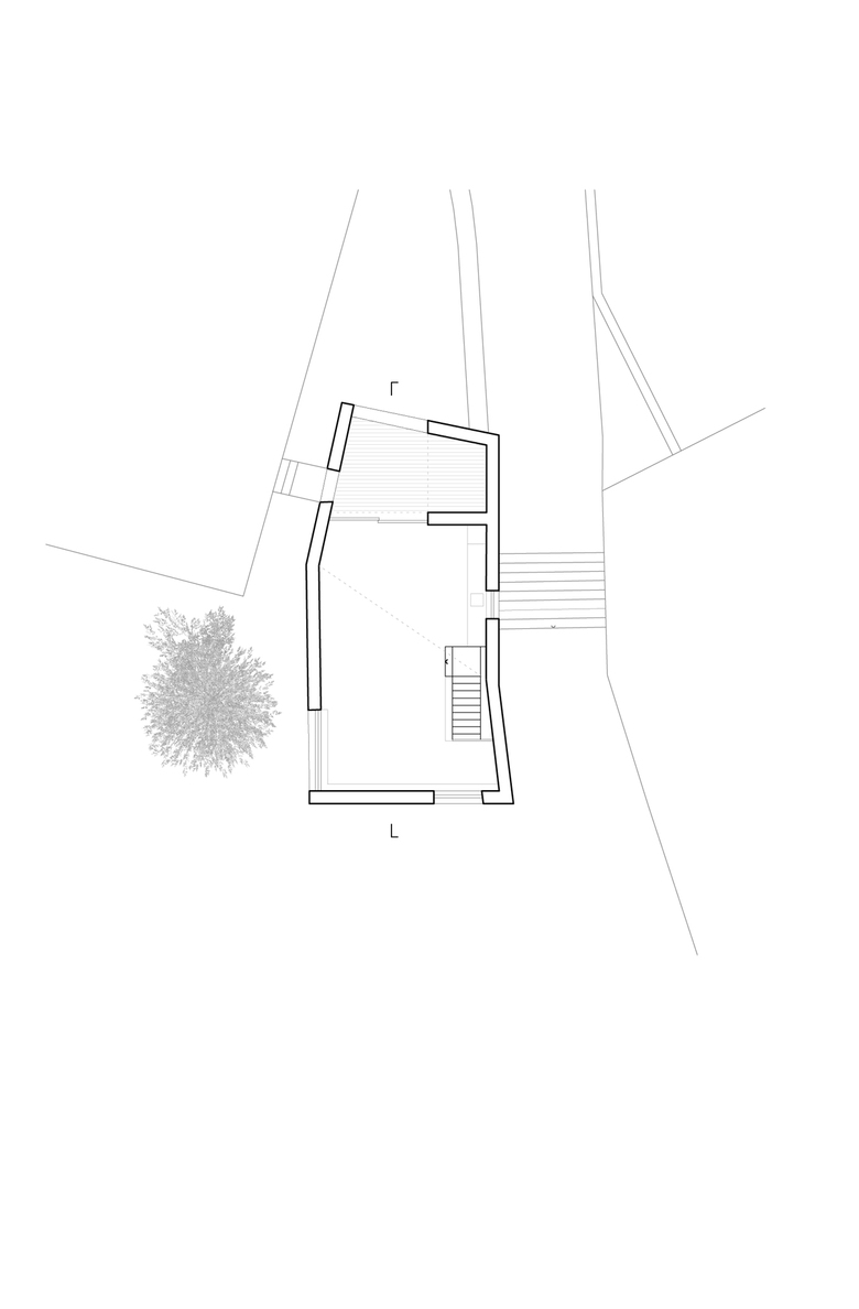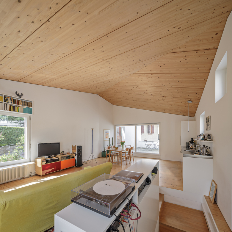 Über den massiven Grundmauern der ehemaligen Garage spannt sich ein polygonales Holzbauvolumen, das zugleich Küche, Esszimmer, Wohnraum und Sitznische ist. Eine eingeschriebene Terrasse funktioniert zudem als brückenbildendes Element zu den Bestandswohnbauten.