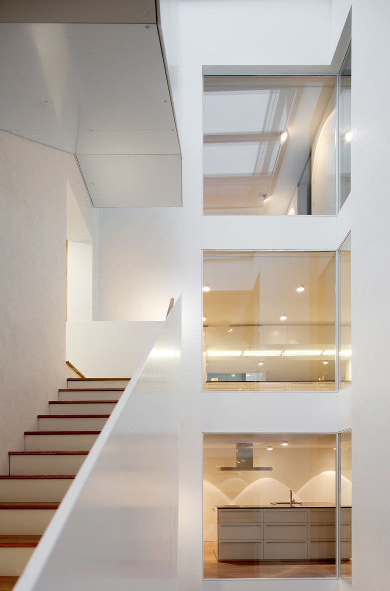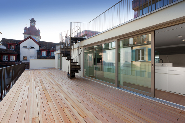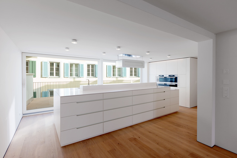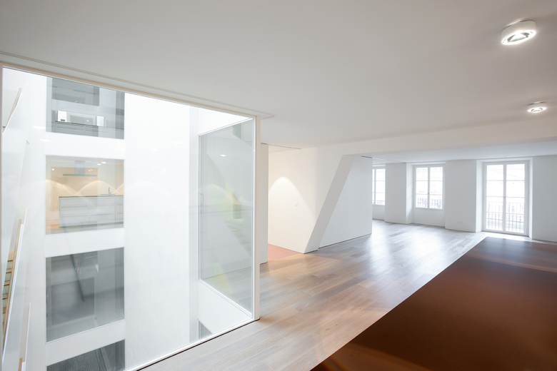 Beim neuerlichen Umbau des unter Denkmalschutz stehenden Gebäudes entstanden ein Verkaufsladen, sechs 3.5 Zimmer Wohnungen und eine 5.5 Zimmer Wohnung im Luxussegment. Über die nach Süden ausgerichtete Hauptfassade erhält jede der Wohnungen Bezug zur Reuss mit Blick auf den Pilatus. Aufgrund der immensen Gebäudetiefe von 22m profitieren die Wohnungen zusätzlich von einem neu eingeführten Lichthof. Der Lichthof ist am historischen Übergang von Vorder- und Hinterhaus platziert. Er sorgt für Tageslicht in den innen liegenden Zonen und leistet einen wichtigen Beitrag zur Verbesserung des Raum- und Wohnhygiene. Die Wohnungen und das Treppenhaus profitieren gleichermassen von der neuen natürlichen Belichtung und der Innenhof wird zum zentralen verbindenden Element zwischen den Wohnungen. Die siebenachsige Südfassade zur Reuss ist in den Obergeschossen mit zwei Balkonen pro Geschoss ergänzt worden.