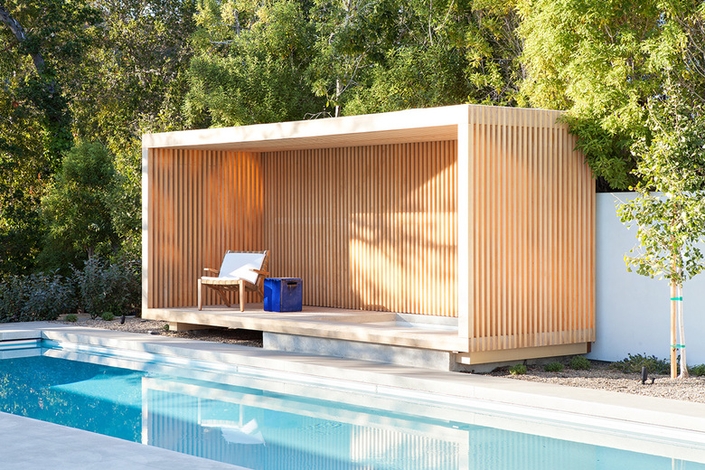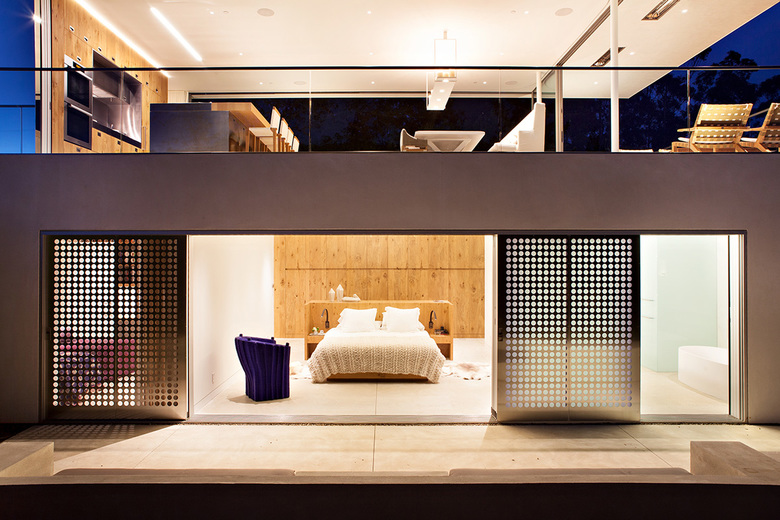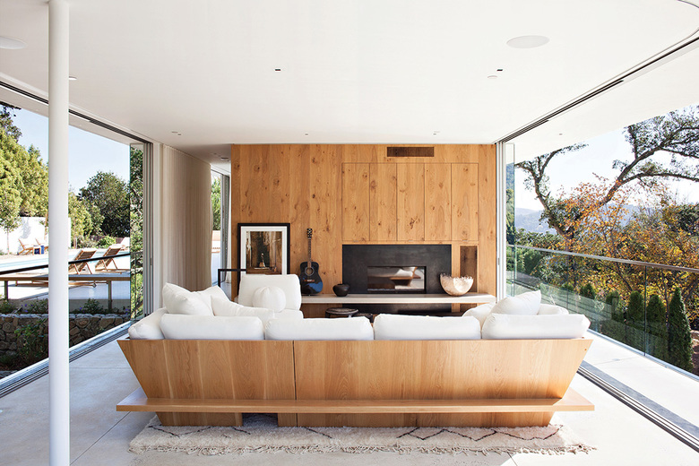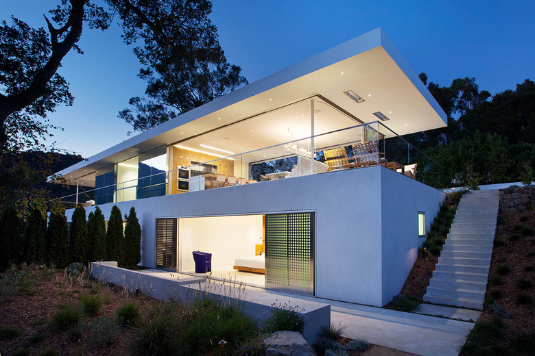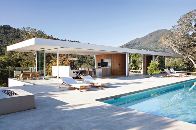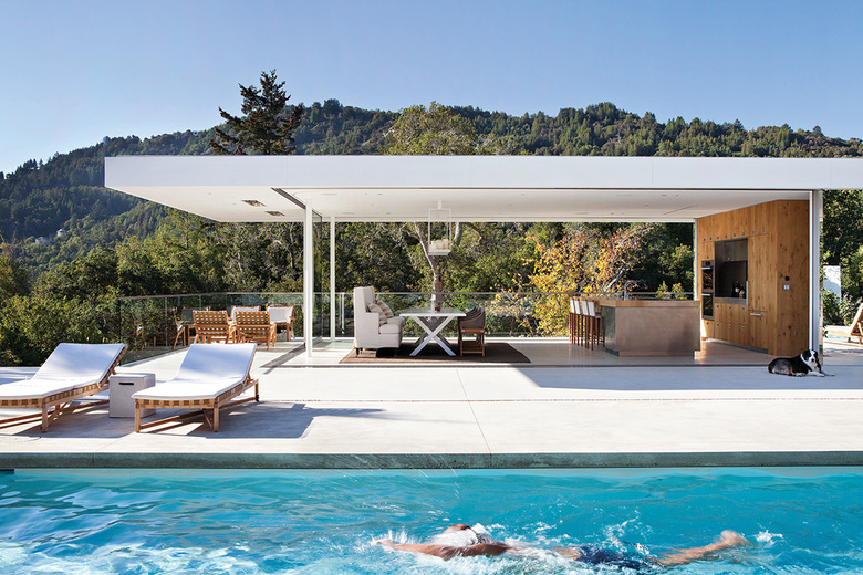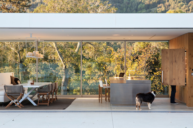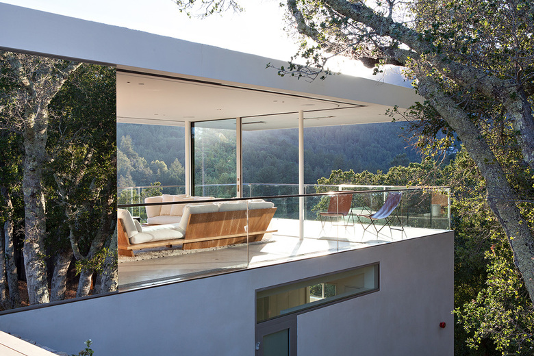 A plinth and a pavilion. Nestled into the hillside, the long, solid plinth contains the private rooms of the house. Atop this plinth sits a transparent living and dining pavilion that opens up completely for access to the outdoor decks, pool patio and expansive views to Mount Tamalpais and the bay. An elegant structural solution allows the views to be uninterrupted by perimeter sheer walls. The majority of the site is left undeveloped with its forest of native oaks intact.