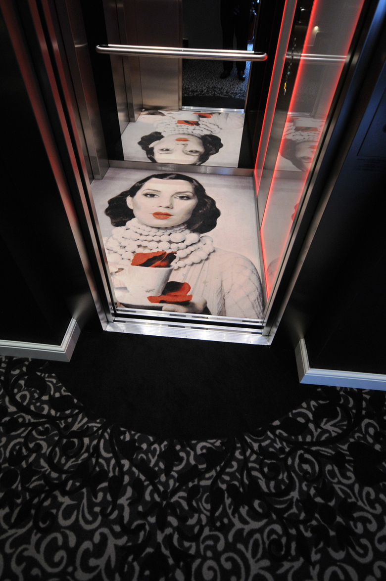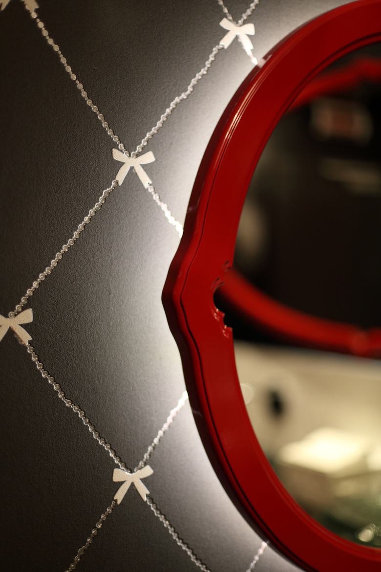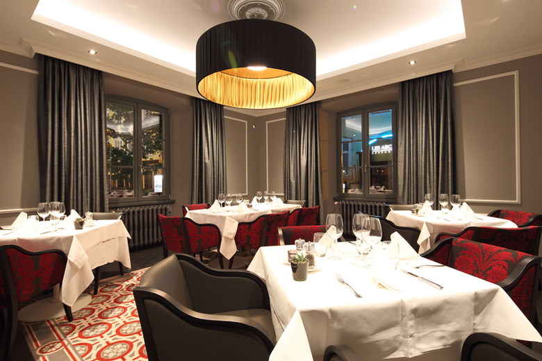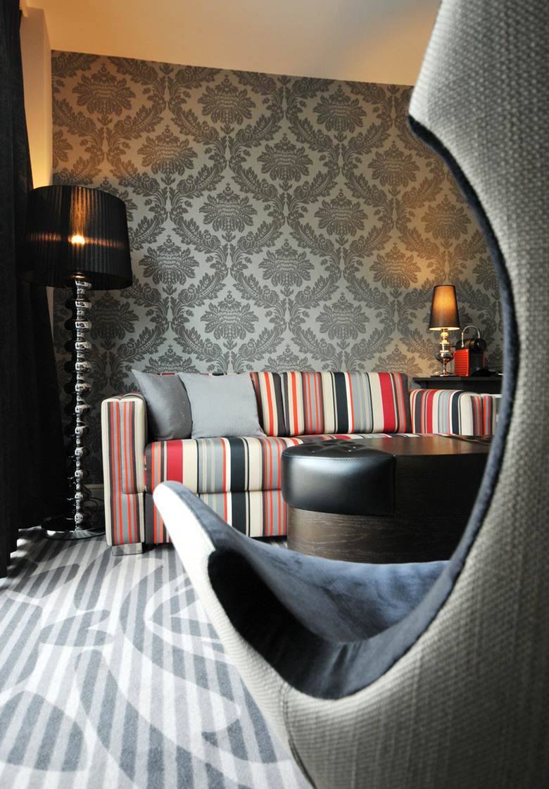 In den öffentlichen Bereichen des Fünf-Sterne-Suitenhotels sowie in einem der drei Zimmertypen, den Château-Suiten, wurde mit einer Farbkombination aus Schwarz, Rot- und Granittönen gespielt. So wird den Gästen auf allen Treppen der rote Teppich ausgerollt, der dann in das in Grautönen gehaltene Design des anschließenden Flurs reinläuft. Das Restaurant ‚Da Lonati‘ teilt sich in einen vorderen Bereich sowie eine ‚fine dining area‘ im hinteren Teil. Dieser hintere Bereich lässt sich je nach Bedarf auch in zwei einzelne Räume unterteilen. Die grauen Trennwände sind aus Holz und mit klassischen weißen Strukturleisten besetzt. Diese Optik wurde auch auf die festen Wände übertragen, wodurch die mobilen Einheiten im Raum zu verschwinden scheinen. Das Teppichdesign ist – als Hommage an die Vergangenheit des Hauses – an ein historisches Fliesenmuster mit Holzoptik aus dem Eingangsbereich des Restaurants angelehnt.