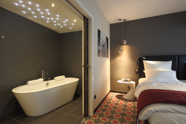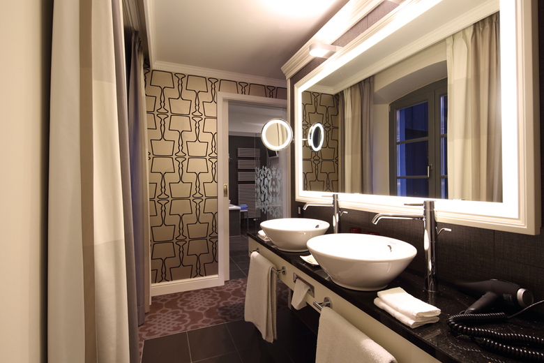 Was alle Zimmertypen gemein haben, sind die großzügigen Bäder mit exklusiven Wellness-Details – in Dunkelgrau, Hellgrau und Weiß gehalten, mit farbigen Akzenten, immer entsprechend des jeweiligen Zimmerkonzeptes. Ausgestattet mit einem Whirlpool oder beispielsweise mit einer freistehenden Badewanne unter einem Sternenhimmel aus kleinen Kristallleuchtern, die gedimmt oder einzeln steuerbar sind, oder mit einer überdimensionalen Doppeldusche, hat jeder Gast seine private Wellnessoase, die zum Entspannen einlädt!